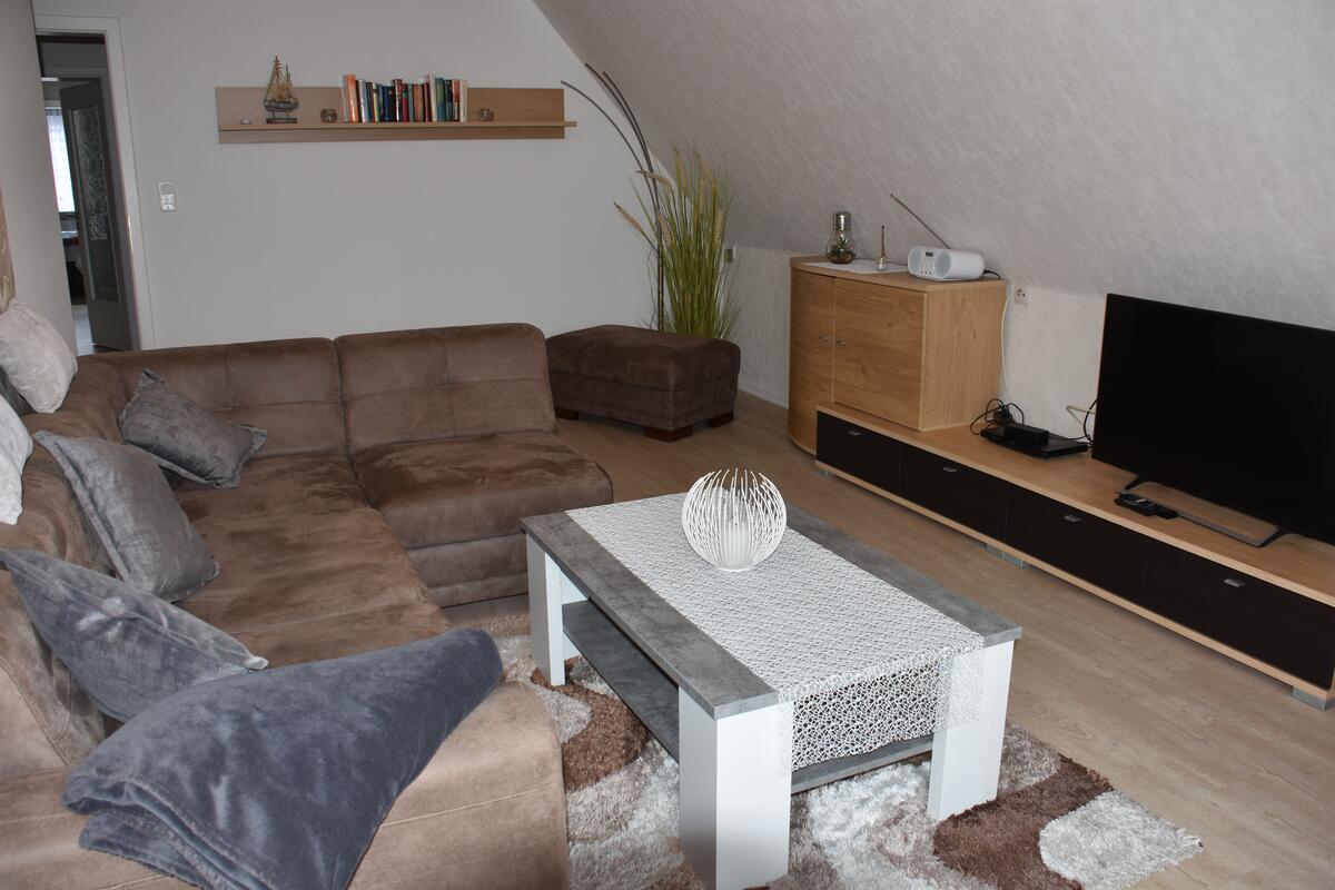Das lichtdurchflutete Wohnzimmer ist ausgestattet mit einer bequemen Couch (auch als Aufbettung geeignet) und einem Flachbildfernseher.