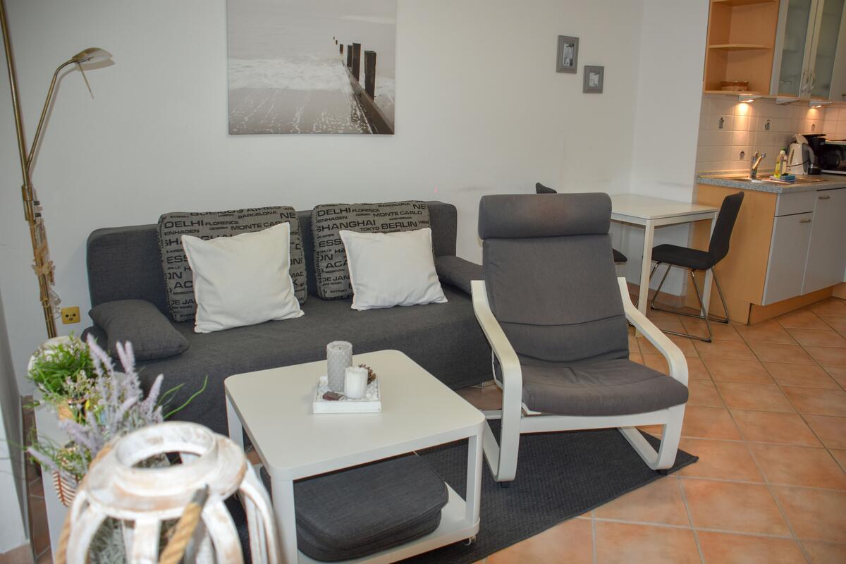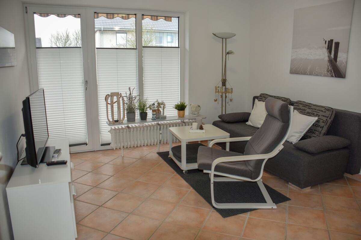 Das helle und freundliche Wohnzimmer ist mit einem gemütlichen Schlafsofa, einem Schwingstuhl, Flachbild-TV, einem DVD-Player für gemütliche Fernsehabende und einem Essplatz für 3 Personen eingerichtet.