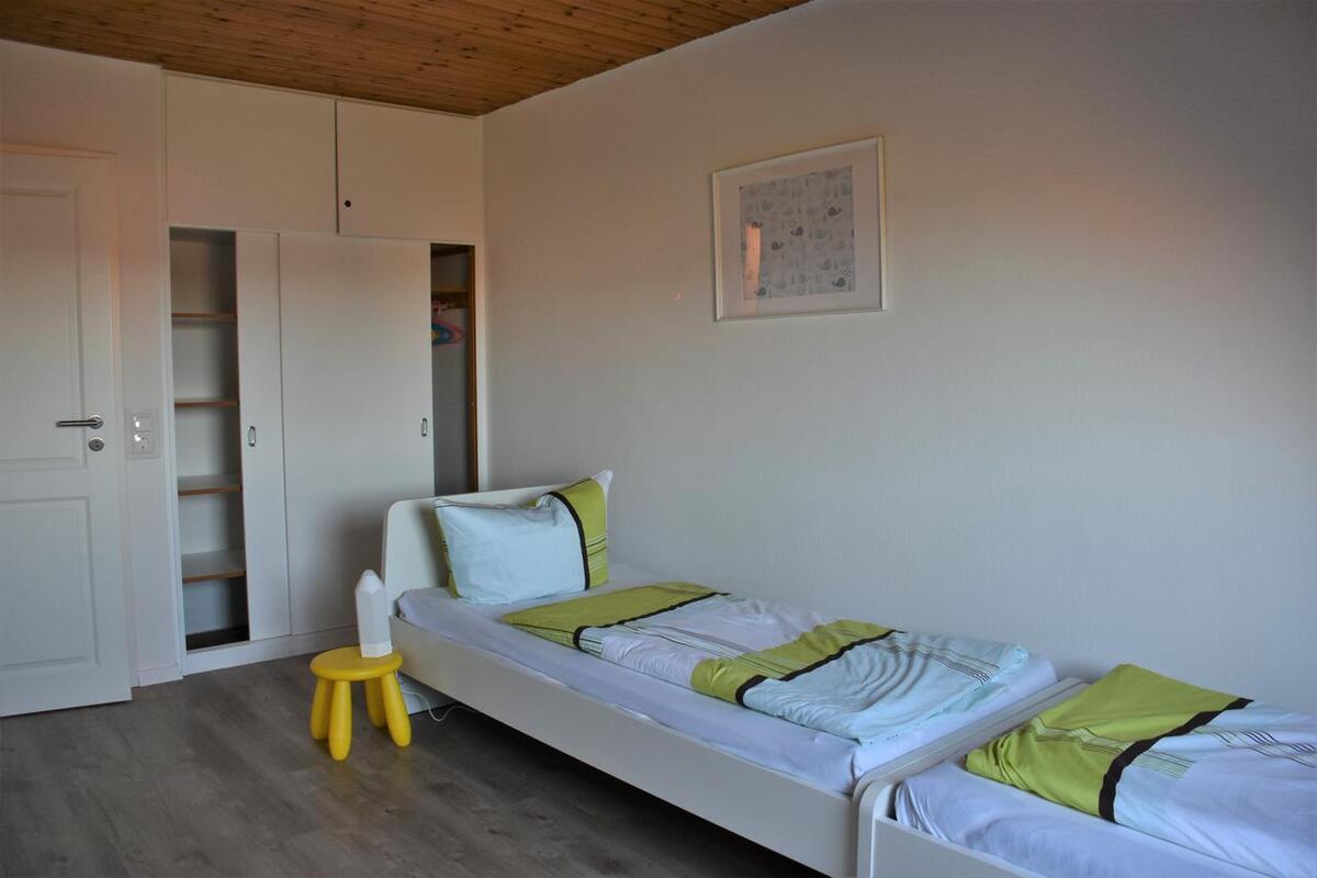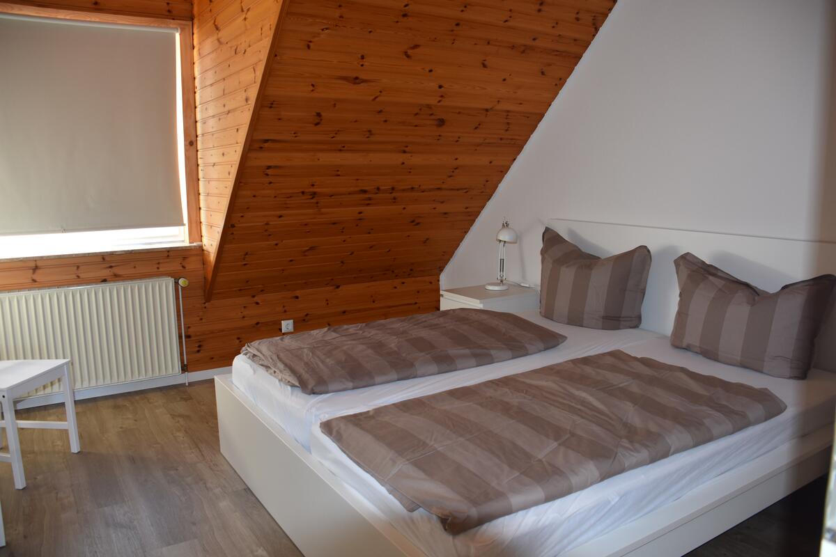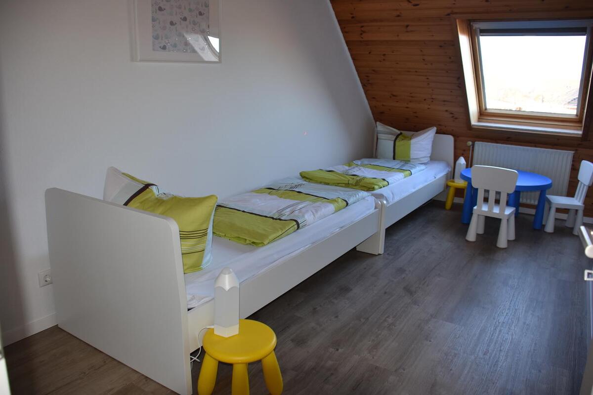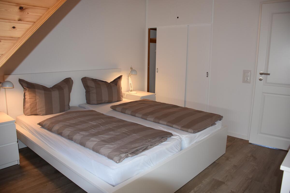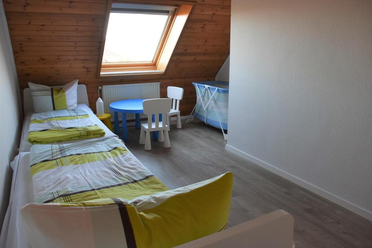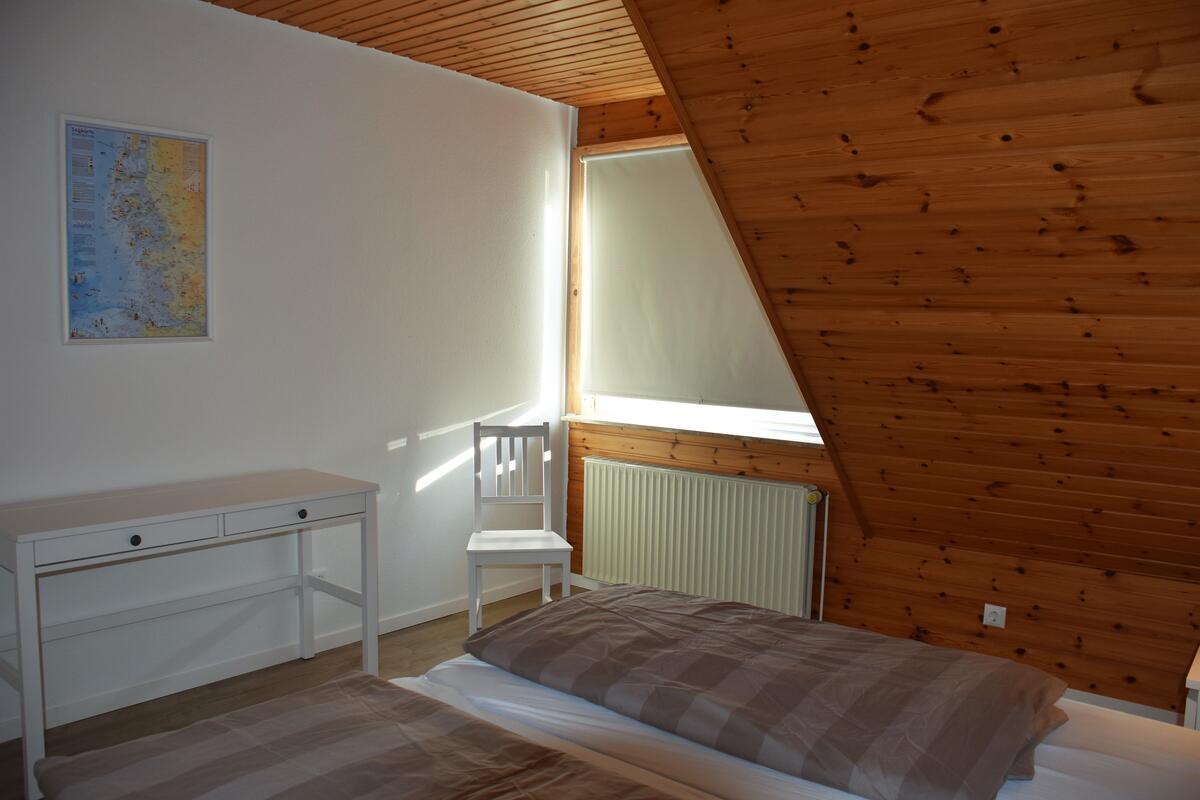 Vom Wohnbereich führt eine Treppe ins Obergeschoss zu den zwei gemütlichen Schlafräumen: Ein Schlafzimmer mit Doppelbett sowie ein Schlafraum mit zwei Einzelbetten und einem Babybett.