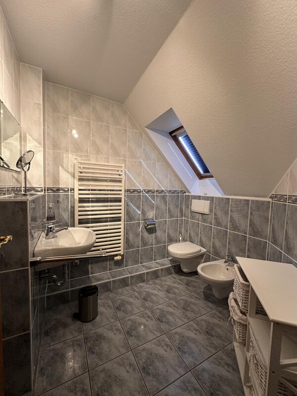 Das Tageslichtbad bietet eine kleine Wohlfühloase mit bodentiefer Dusche mit Vorhang, einem Waschbecken, WC und Bidet.