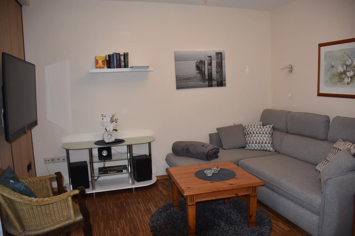 Das rustikal, aber dennoch gemütlich eingerichtete Wohnzimmer mit einem bequemen Ecksofa mit Schlaffunktion, Flat-TV und Essplatz lädt zum längeren Verweilen ein.