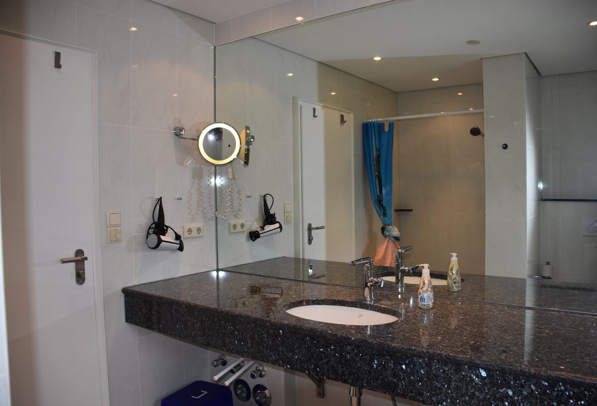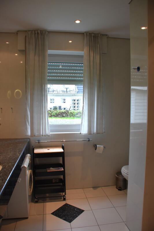 Das helle große Tageslichtbad mit viel Ablagefläche ist mit Kosmetikspiegel, Dusche, WC und Waschmaschine ausgestattet.