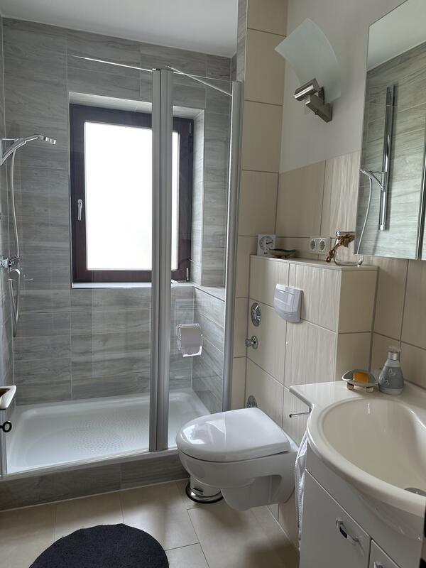 Das moderne Tageslicht-Bad ist mit einer großen Duschkabine, Waschbecken und WC ausgestattet. Genügend Stauraum für Ihre Kosmetika gibt es auch.