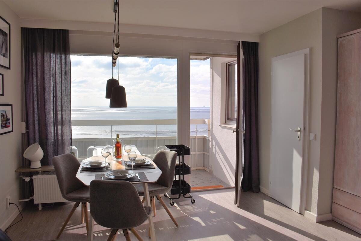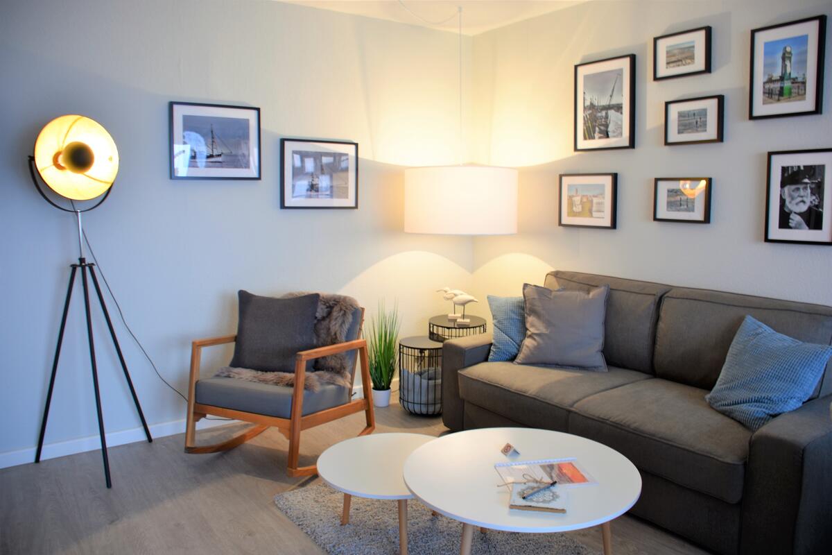 Das lichtdurchflutete Wohnzimmer ist mit hellen Möbeln und passenden Accessoires ausgestattet. Entspannen Sie auf dem gemütlichem Sofa (Schlafsofa) bei einem guten Film oder genießen Sie ein ausgewogenes Frühstück mit Blick auf das Meer.