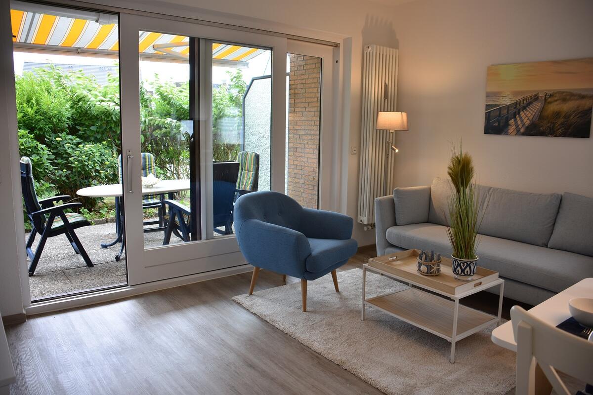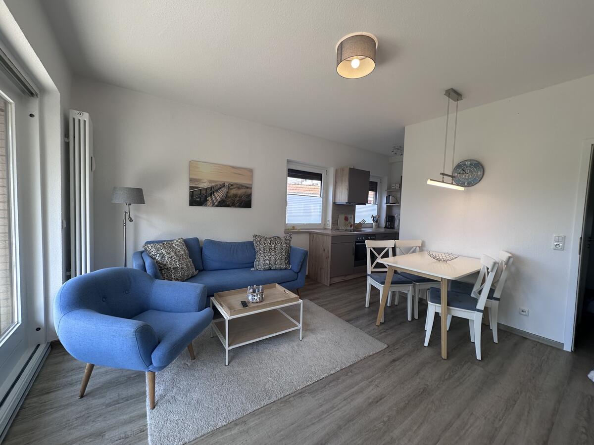 Das helle und freundliche Wohnzimmer ist ausgestattet mit einem Sofa, einem Flachbild-TV und Essplatz. Die angrenzende Küchenzeile bietet alles was Sie zum Kochen benötigen, inkl. Geschirrspüler.