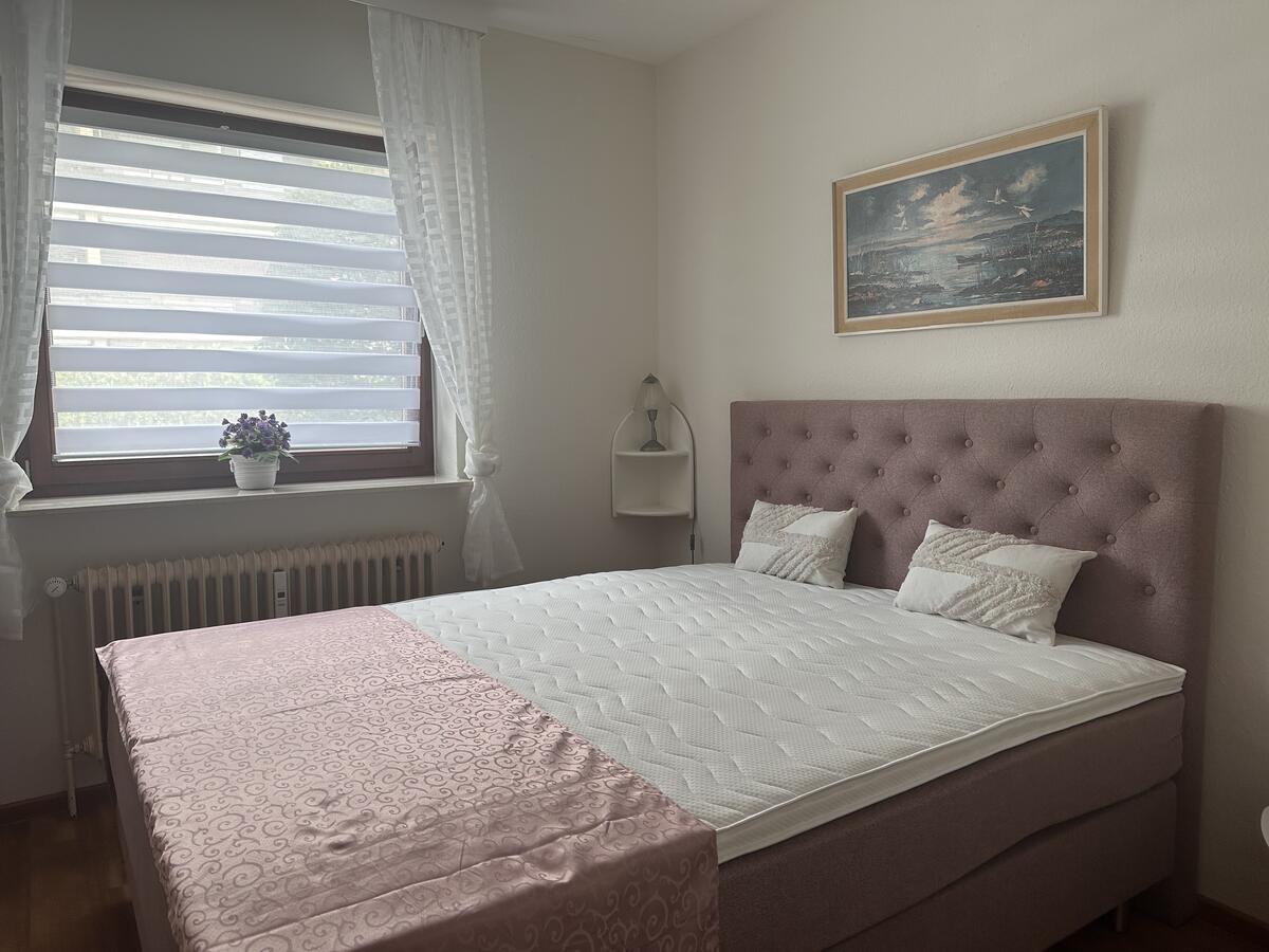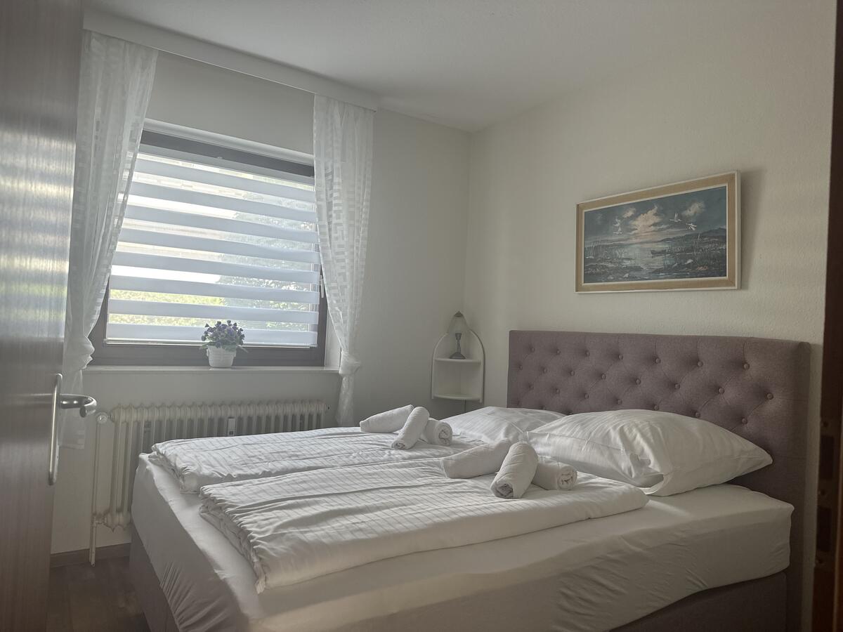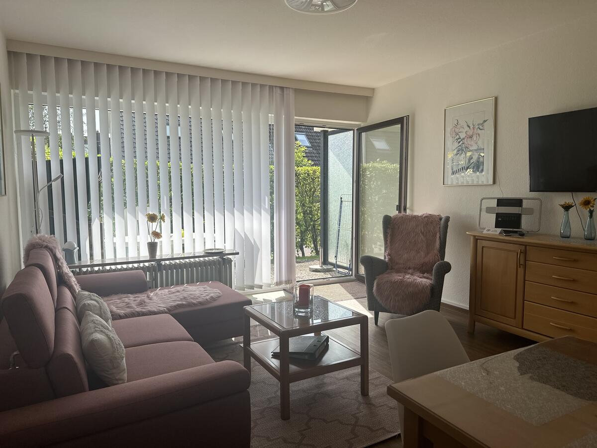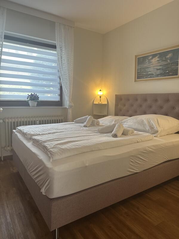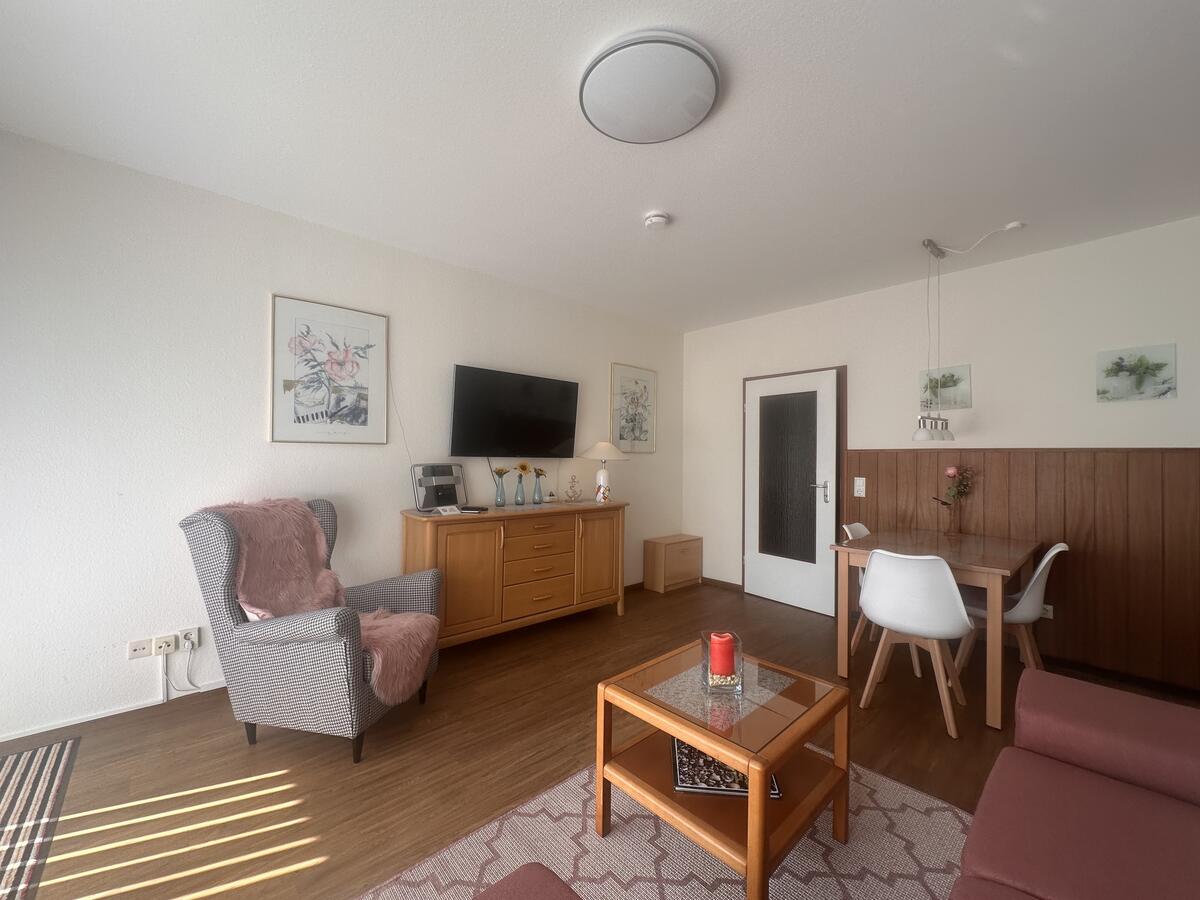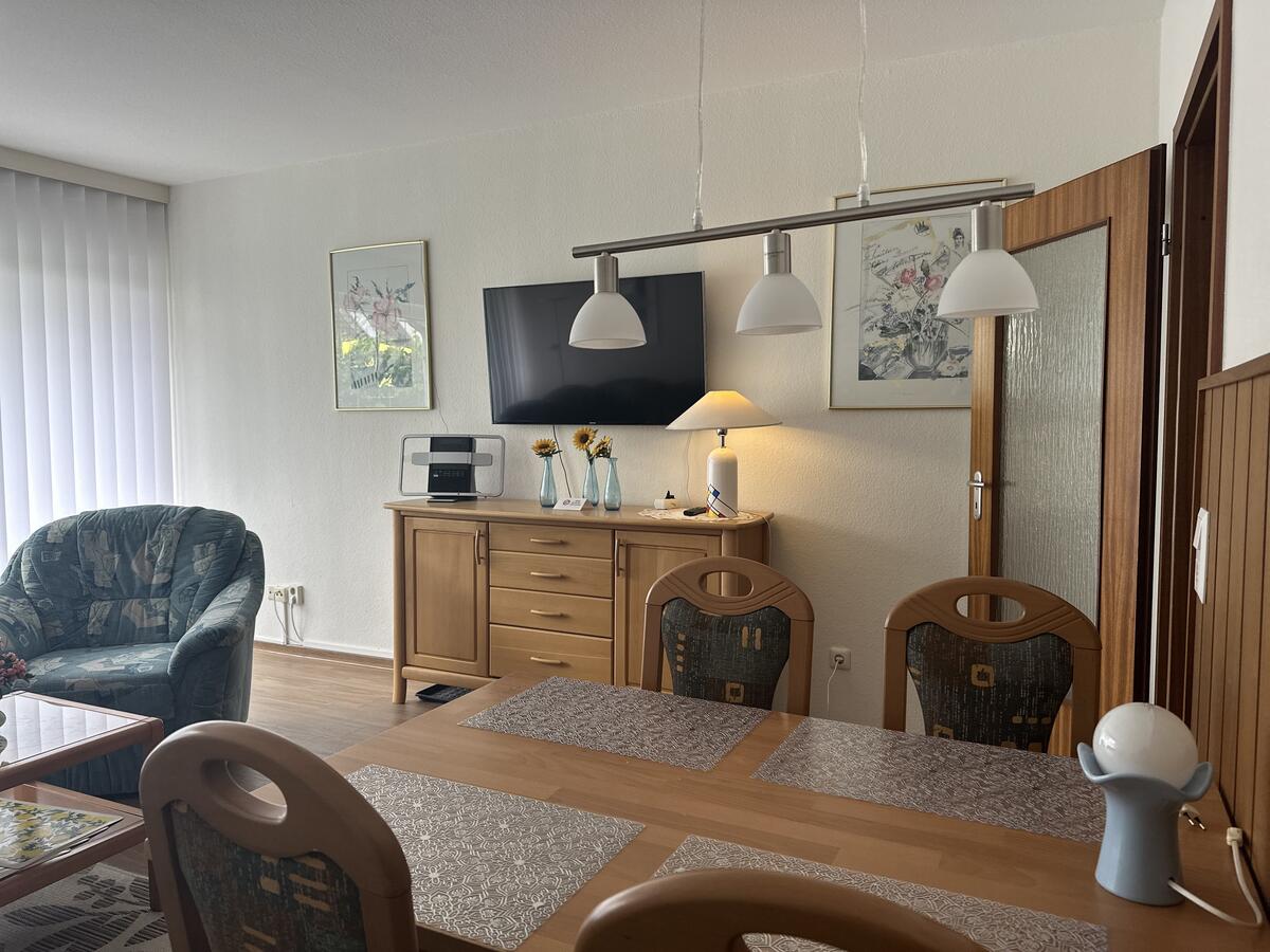 Das Wohnzimmer ist ausgestattet mit einer gemütlichen Couchgarnitur, die nach Bedarf auch als Schlafcouch genutzt werden kann, einem Esstisch mit 4 Stühlen und großem Flachbild-TV mit Sat-Anschluss. Zur Wohnung gehören weiterhin ein Schlafzimmer mit Boxspringbett, eine kleine Küche mit kompletter Ausstattung sowie ein Tageslichtbad mit Dusche und WC.
