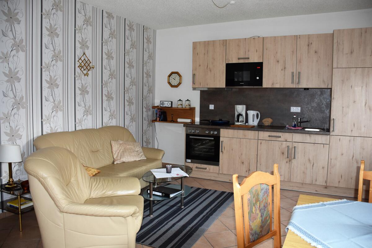 Neue Küchenzeile bestehend aus Kochfeld, Backofen, Spülbecken, Kühlschrank mit Eisfach, Kaffeemaschine. Bestecke und Geschirr für den täglichen Bedarf sind natürlich vorhanden.