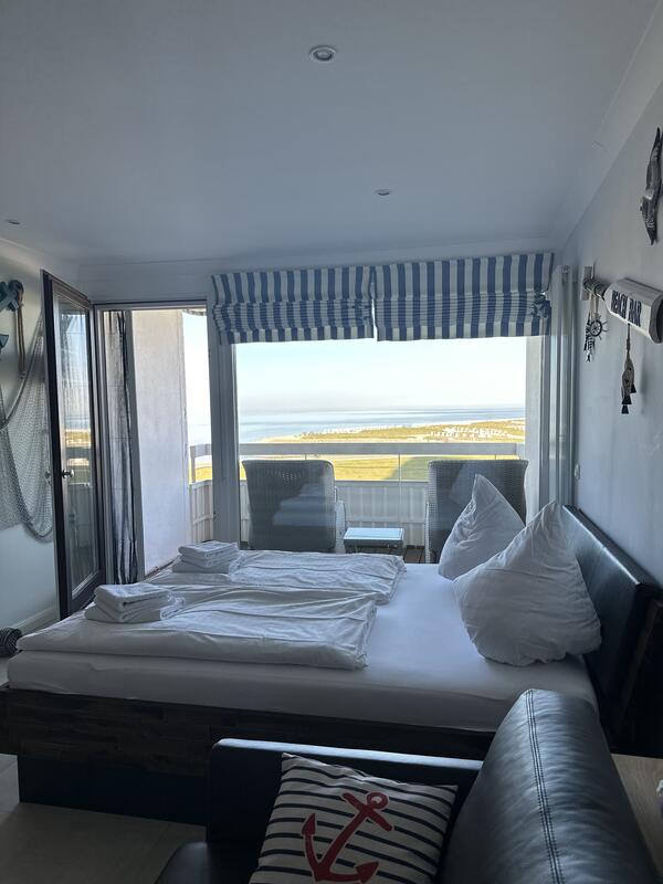 Der offene Wohn-/Schlafbereich mit feststehendem Bett ist der perfekte Erholungsplatz für Sie. Egal ob vom Sofa oder vom Bett, Sie können abends gemütlich einen Film gucken oder Netflix (mit eigenem Account) streamen oder Sie genießen einfach den traumhaften Ausblick auf das Meer und die Perlebucht.