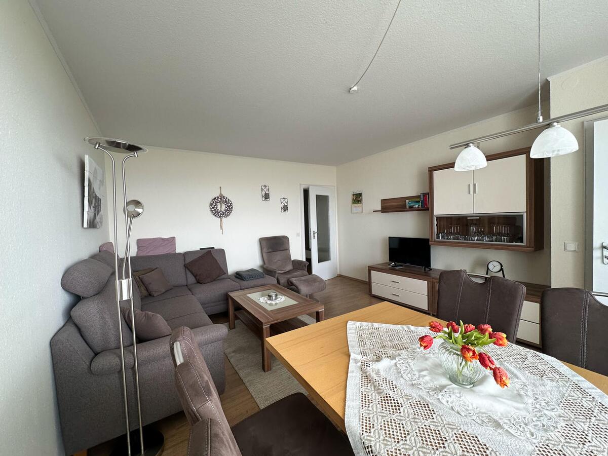 Der helle Wohnraum ist komfortabel eingerichtet mit einer Doppelschlafcouch, einem Flachbild-TV und einem Essplatz für 4 Personen.