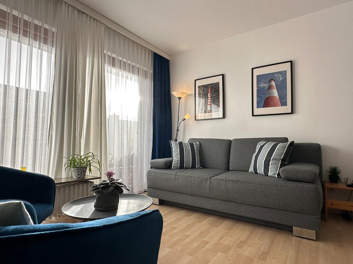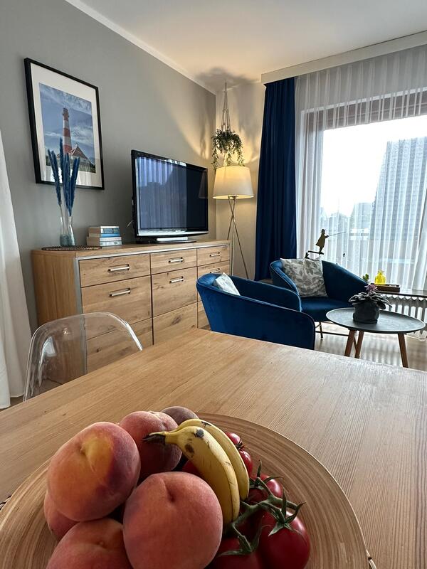 Das helle und freundliche Wohnzimmer ist komfortabel eingerichtet mit einem Schlafsofa, zwei Sesseln und Flachbild-TV, sowie ein Essplatz für 4 Personen.