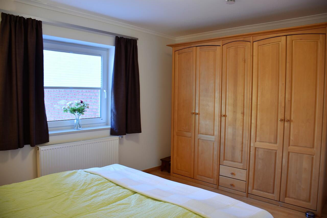 Das große Bad verfügt über eine große bodentiefe Dusche mit breitem Einstieg und WC. Das helle Schlafzimmer ist mit Doppelbett und einem großen Kleiderschrank eingerichtet.