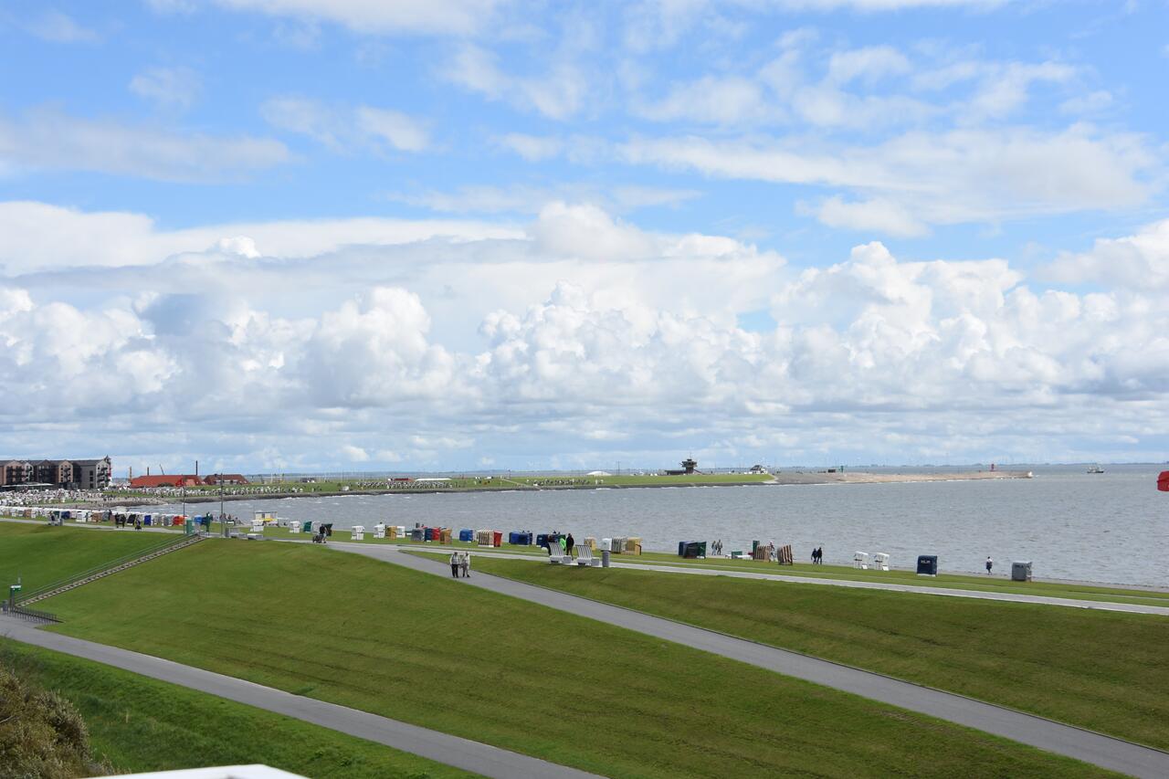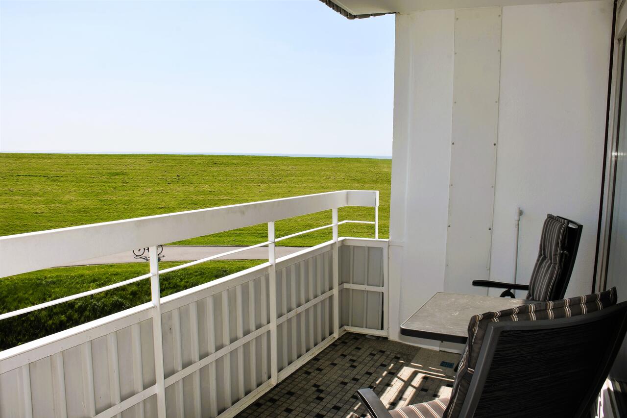 Genießen Sie schöne Sonnenstunden auf dem Balkon (Südseite) mit Blick auf den grünen Deich und über die Deichkrone hinweg auf die Nordsee und vorüberfahrende Schiffe.