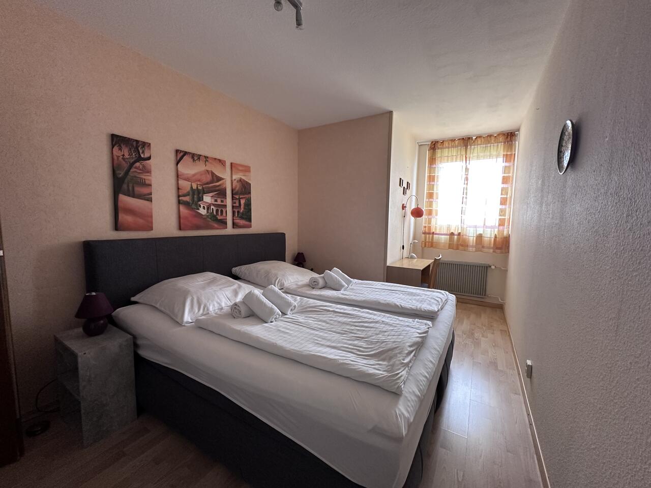 Gut schlafen werden Sie im Schlafzimmer mit Doppelbett und großem Kleiderschrank.