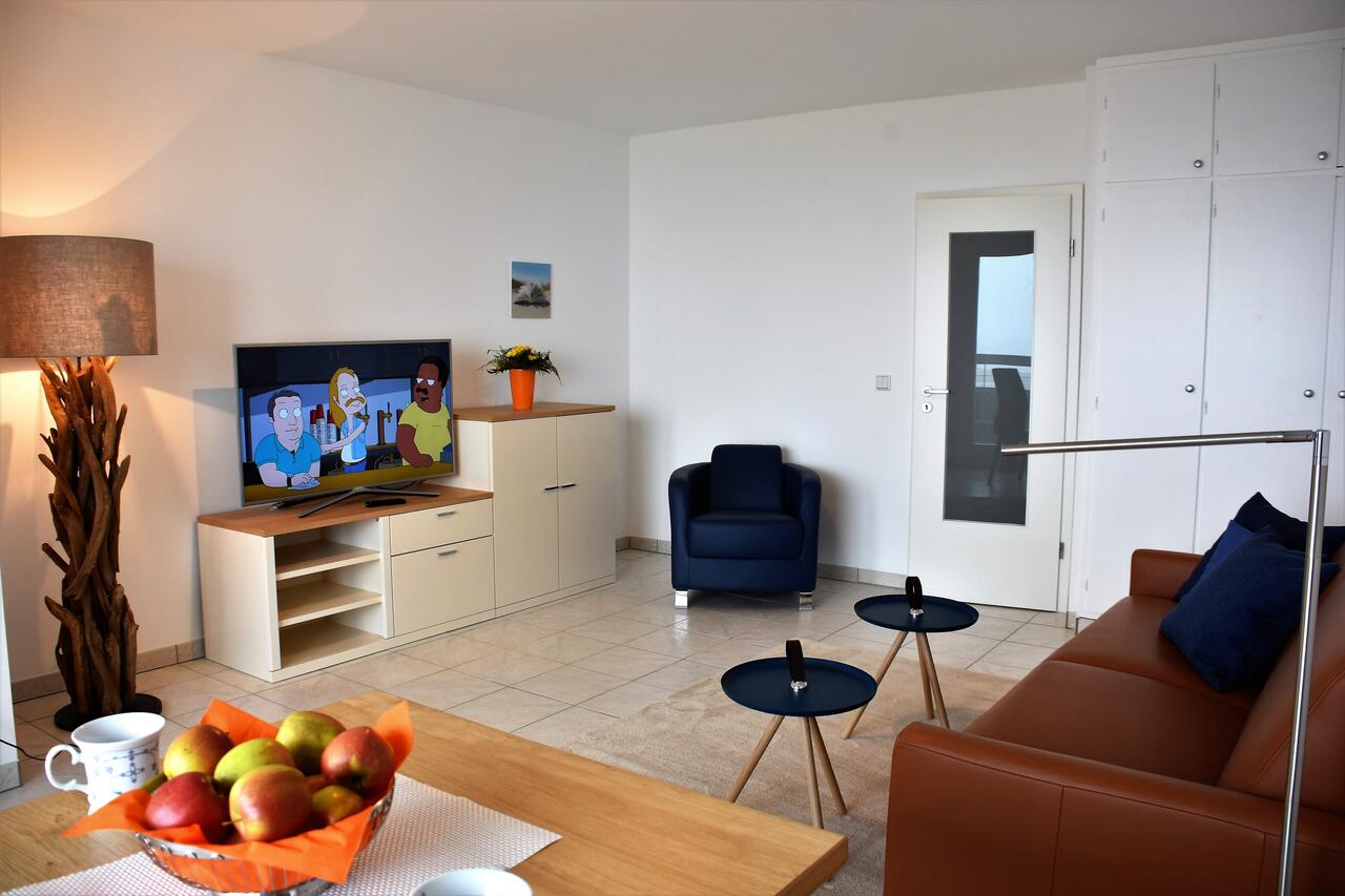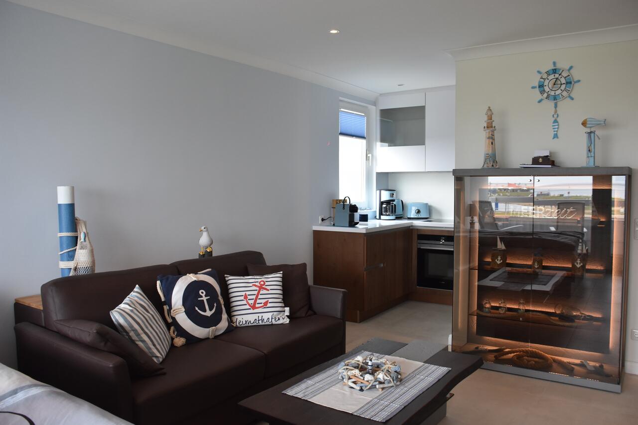 Das lichtdurchflutete Wohnzimmer ist mit hellen Möbeln und passenden Accessoires ausgestattet. Entspannen Sie auf dem gemütlichem Sofa (Schlafsofa) bei einem guten Film oder genießen Sie ein ausgewogenes Frühstück mit Blick auf das Meer.