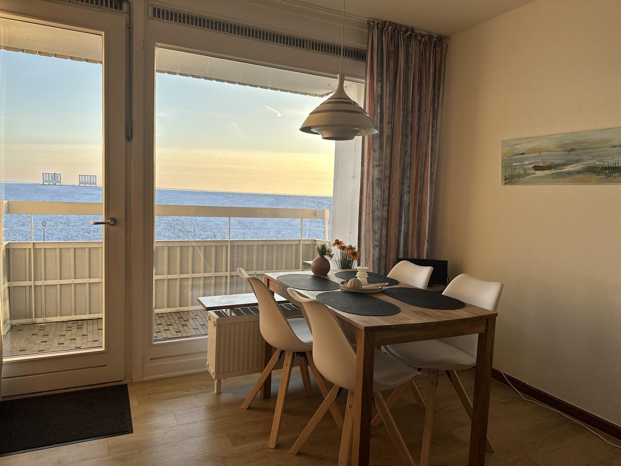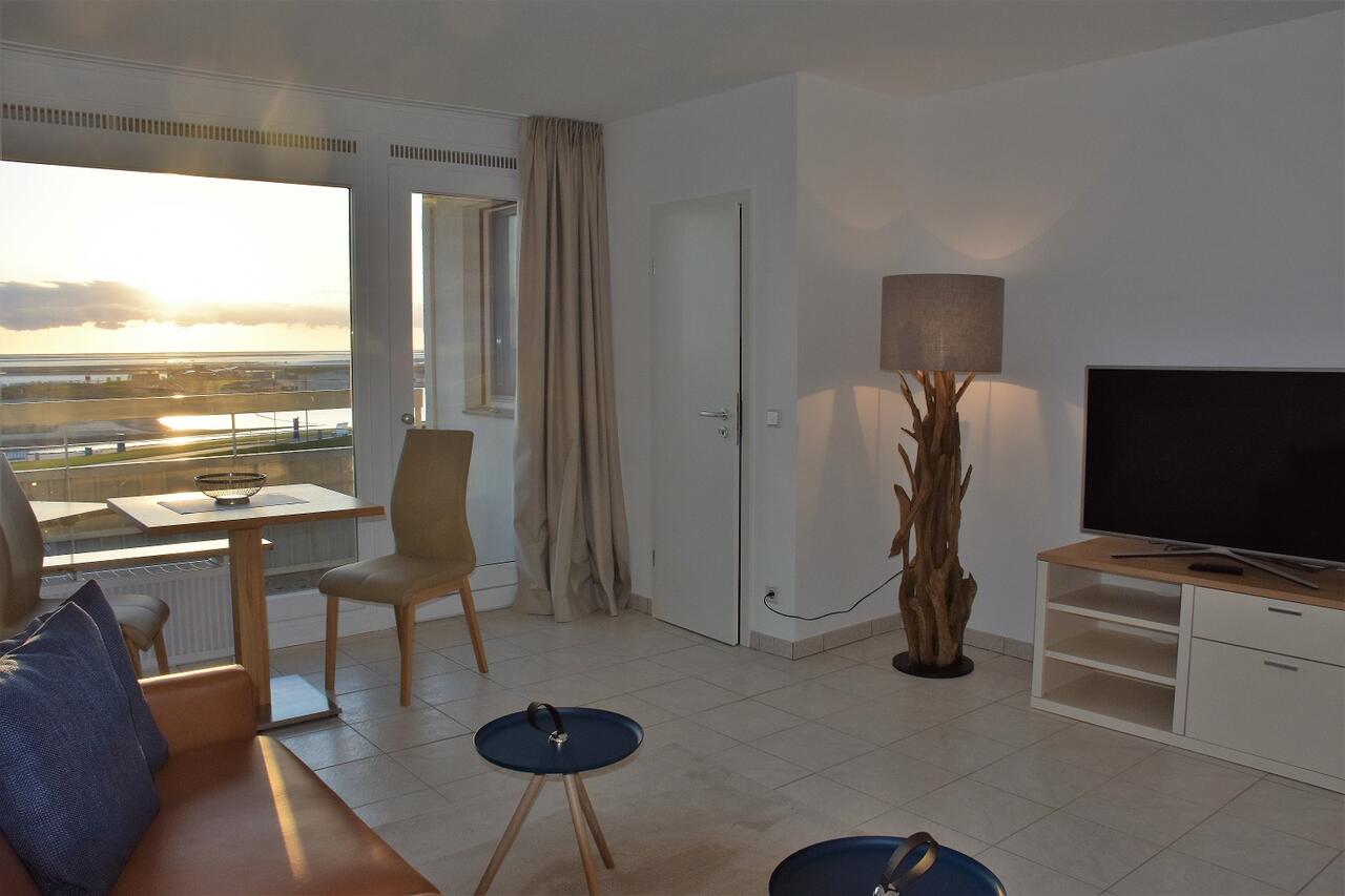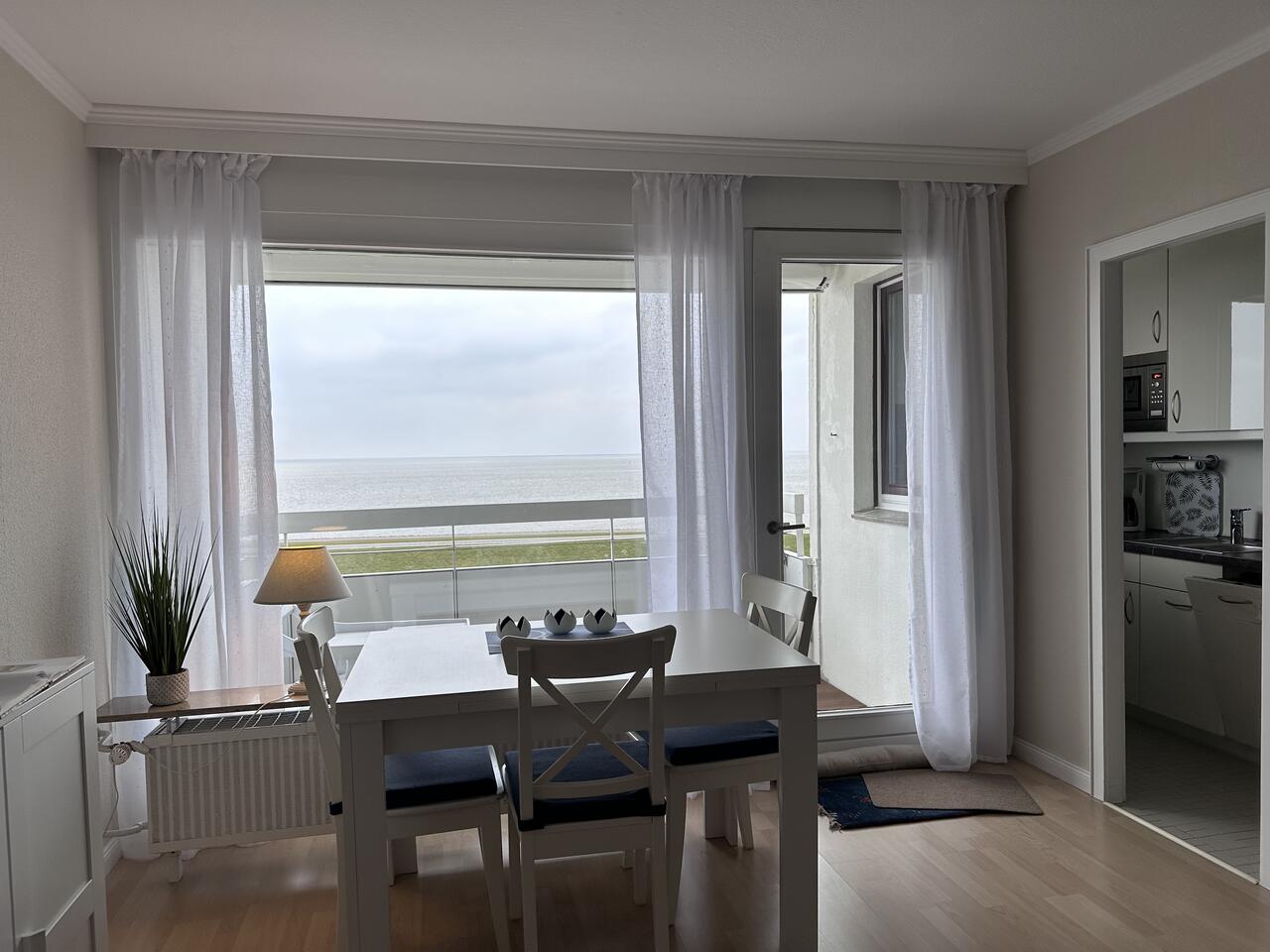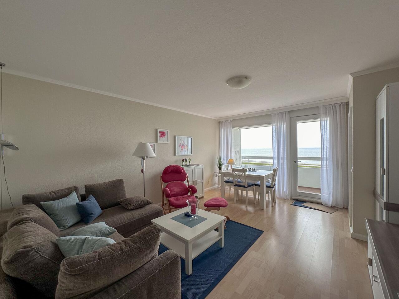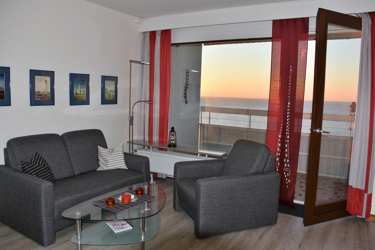 Auf der möblierten Loggia können Sie den Blick über die Nordsee schweifen lassen. Freuen Sie sich auf stimmungsvolle Abende mit grandiosen Sonnenuntergängen über dem Meer. Der Panoramablick ist einfach einzigartig. Im Wohnraumraum erwartet sie eine Couchgarnitur, die nach Bedarf auch als Schlafcouch genutzt werden kann, Kabel-TV und Essbereich.
