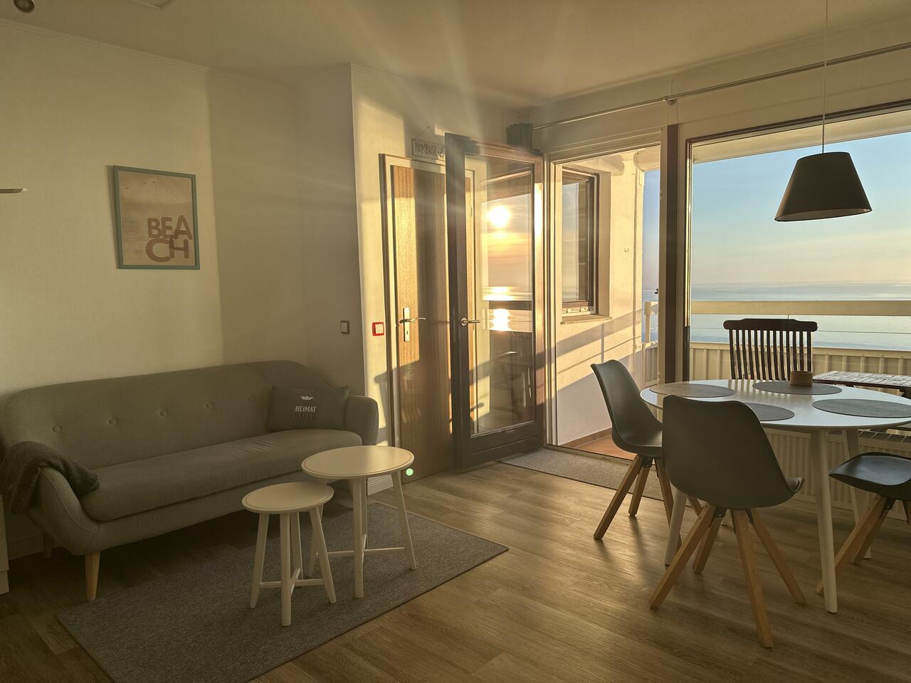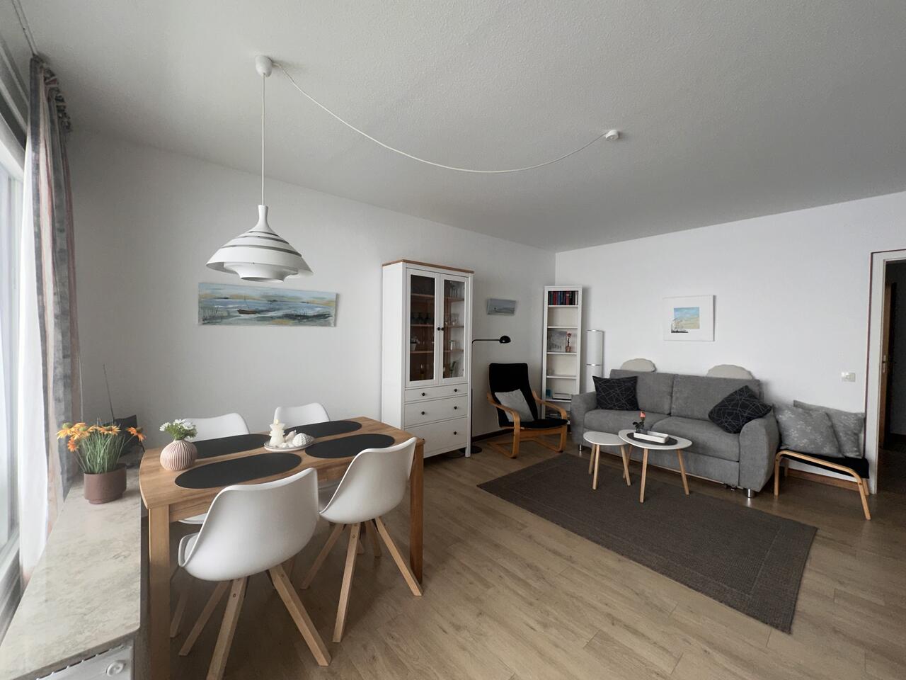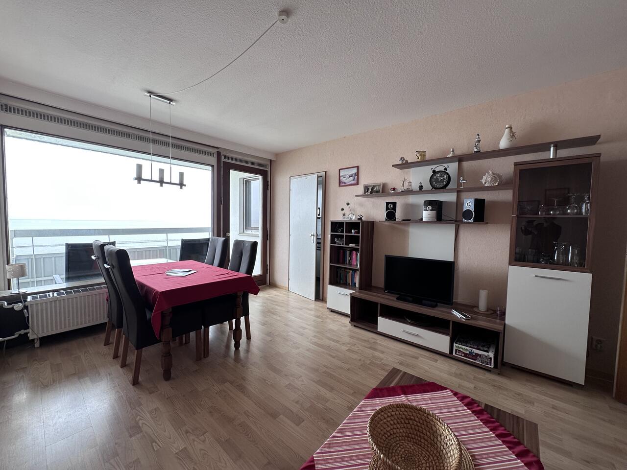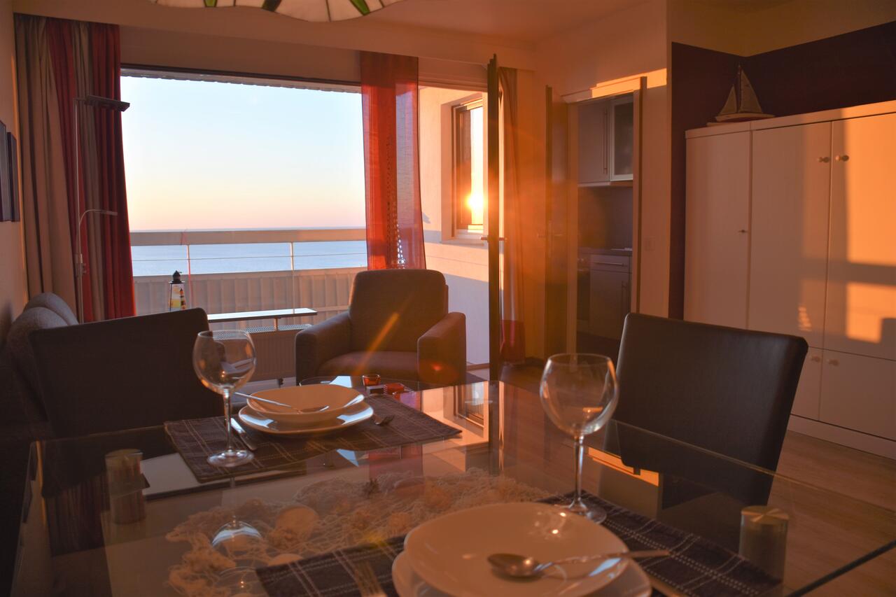 Auf der möblierten Loggia können Sie den Blick über die Nordsee schweifen lassen. Freuen Sie sich auf stimmungsvolle Abende mit grandiosen Sonnenuntergängen über dem Meer. Der Panoramablick ist einfach einzigartig. Im Wohnraumraum erwartet sie eine Couchgarnitur, die nach Bedarf auch als Schlafcouch genutzt werden kann, Kabel-TV und Essbereich.