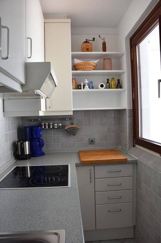 Die Küche ist mit allen nötigen Haushaltsutensilien ausgestattet. Das Bad ist funktional, mit Duschkabine, Waschbecken und WC.
