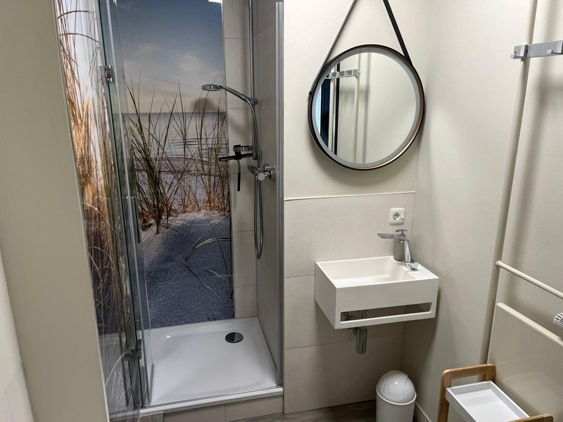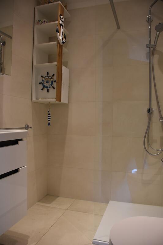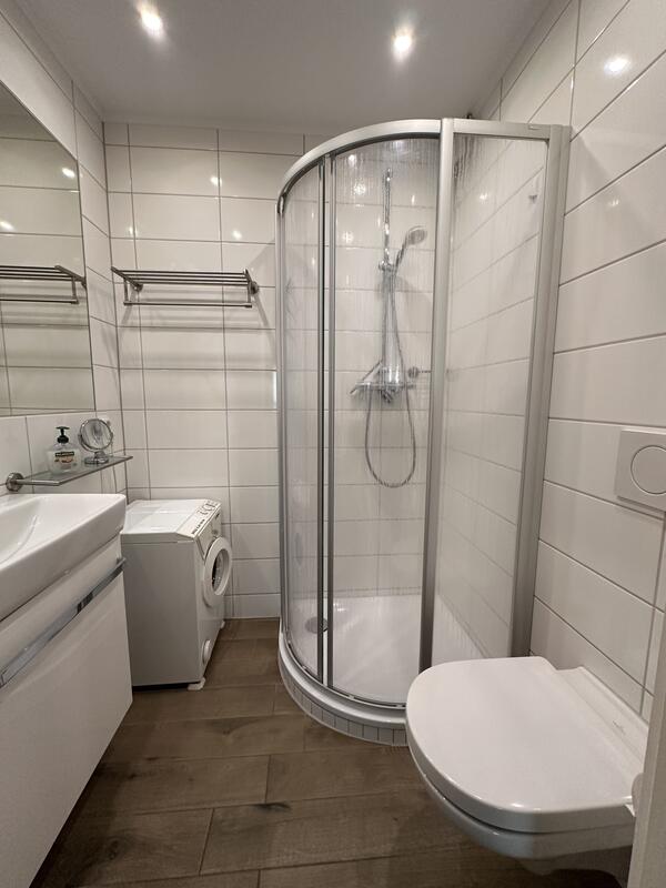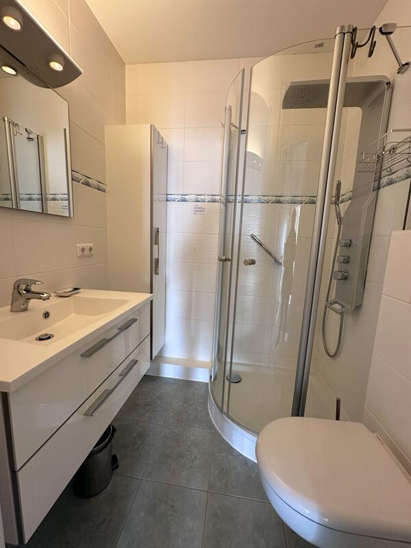 Das Bad ist hell und modern mit einer Runddusche, Waschtisch und WC, sowie genügend Stauraum für Ihre Kosmetika ausgestattet. Eine kleine Waschmaschine ist ebenfalls vorhanden.