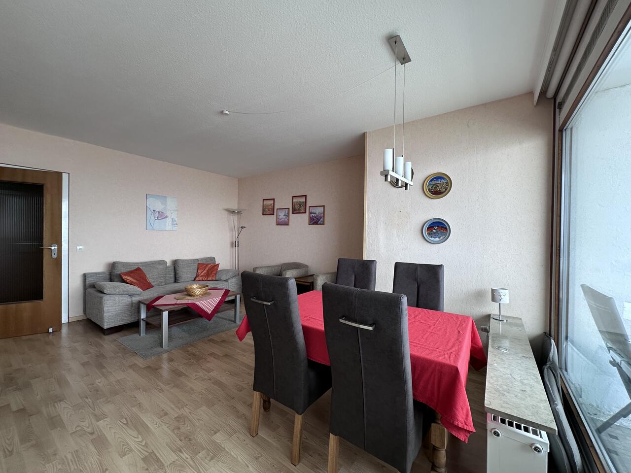 Unsere komfortable Ferienwohnung befindet sich im 4. Stock des Hochhauses.