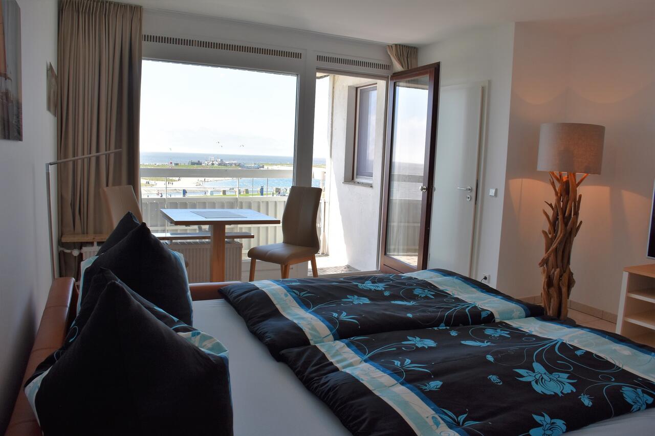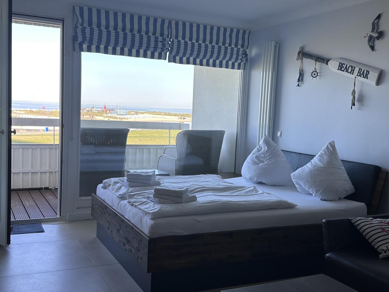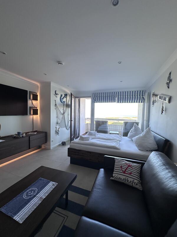 Der Wohn-/Schlafraum ist mit hochwertigen Möbeln ausgestattet. Ein großes Boxspringbett (180x200 cm) bietet genügend Platz zum Erholen. Genießen Sie einen traumhaften Ausblick auf die Nordsee während des Frühstücks oder Abendessen.