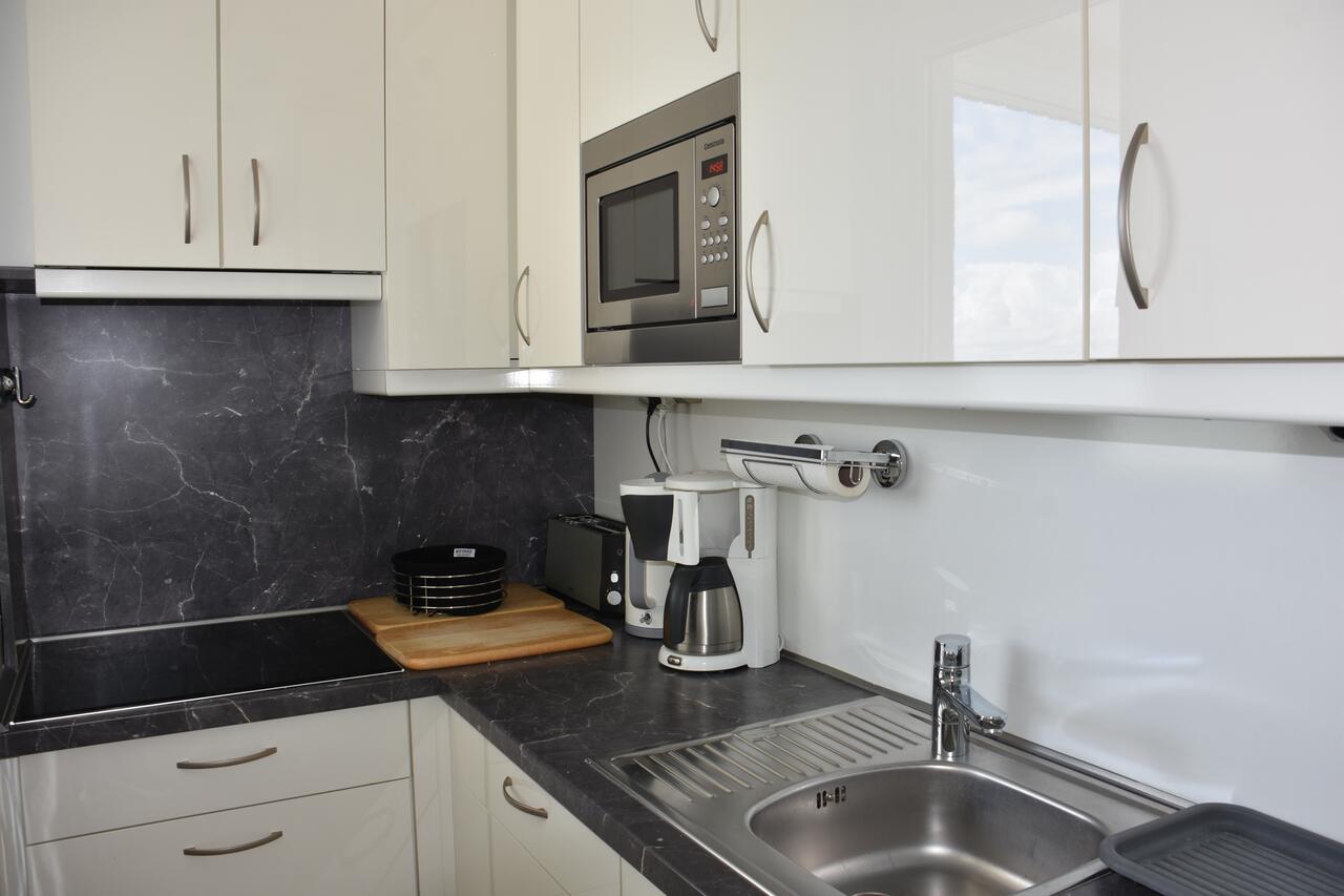 Die Küche, die über ein Touchscreen Induktionskochfeld mit vier Kochzonen und Backofen verfügt und mit allen nötigen Küchenutensilien inkl. Geschirrspüler ausgestattet ist, macht einen Restaurantbesuch überflüssig.