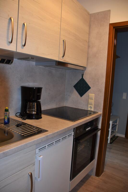 In der Küche mit Speisekammer finden Sie einen Backofen mit Ceran-Kochfeld, einen Kühlschrank mit kleinem Gefrierfach. Ebenfalls finden Sie Geschirr für den täglichen Bedarf, einen Wasserkocher und eine Filter-Kaffeemaschine vor. Das Badezimmer ist zweckmäßig ausgestattet mit Dusche, Waschbecken und WC.