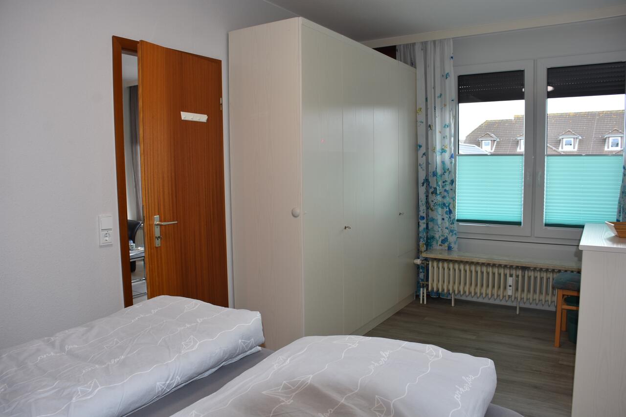 Das Schlafzimmer verfügt über ein Doppelbett (2 einzelne Matratzen, hoher Betteinstieg) und einen Kleiderschrank.