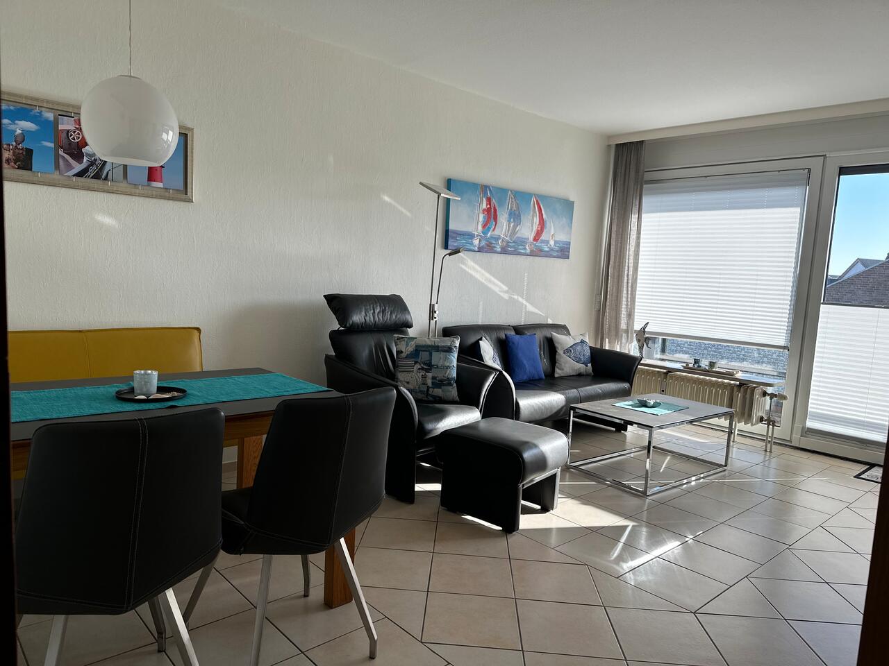 Der Wohnraum lädt mit einer gemütlichen Couchgarnitur bestehend aus einem Sofa und Sesseln, sowie einem Couchtisch, einer Essecke und einem Flachbildfernseher und Radio zum Verweilen ein. Vom hellen Wohnzimmer aus können Sie auf den großen, Balkon treten und Ihren Urlaub genießen.