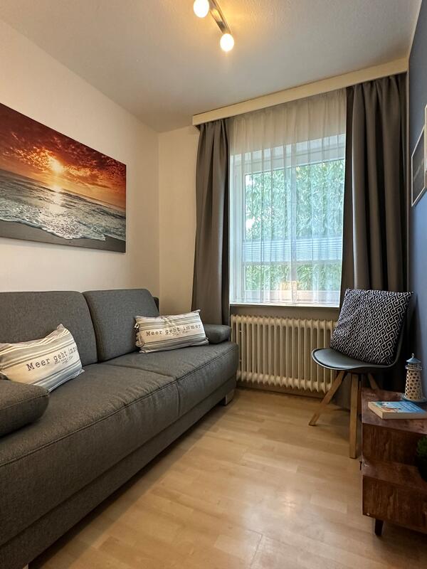 Das helle und freundliche Wohnzimmer ist komfortabel eingerichtet mit einem Schlafsofa, zwei Sesseln und Flachbild-TV, sowie ein Essplatz für 4 Personen.