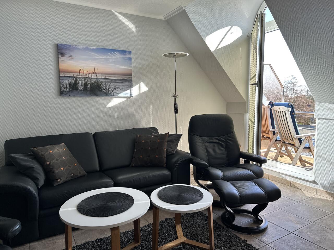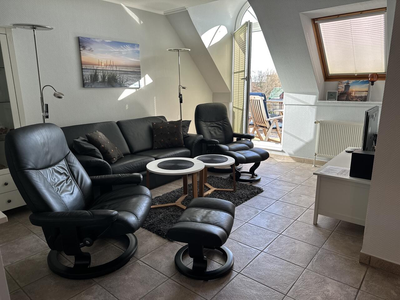 Das Wohnzimmer ist ausgestattet mit einem Schlafsofa (für eine Person), 2 Relaxstühlen mit Fußhocker und einem Flachbild-TV.