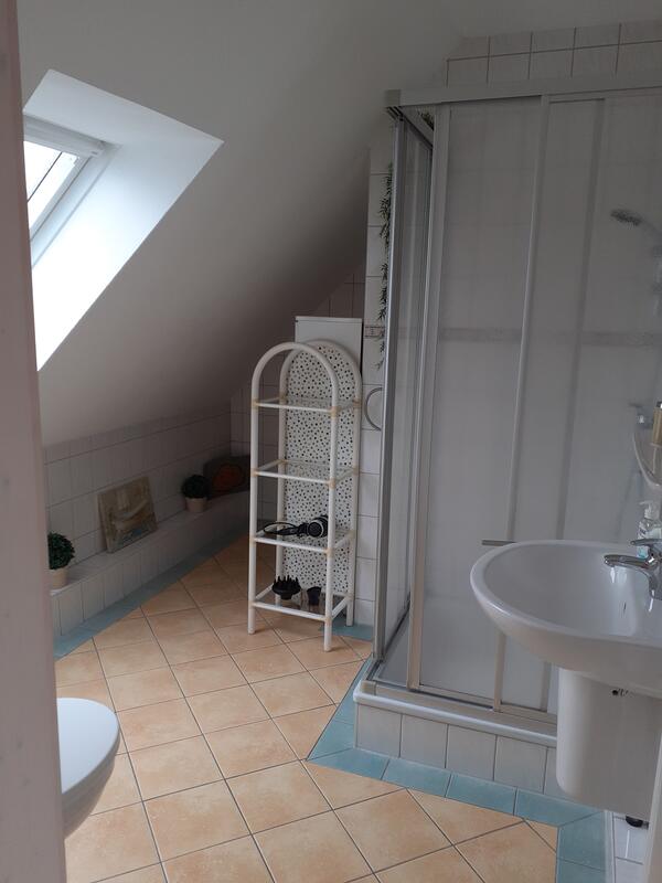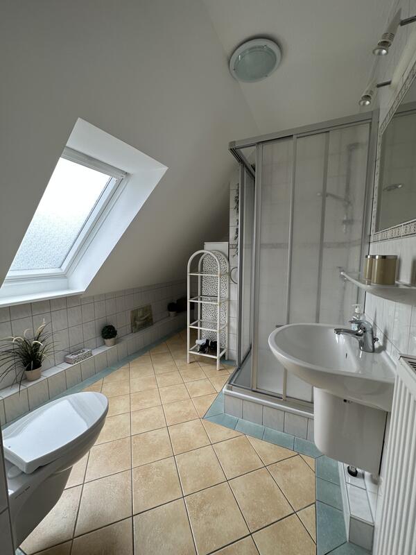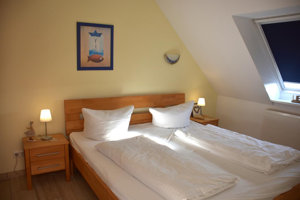 Das Schlafzimmer lädt mit seinem Doppelbett zum Träumen ein. Platz für Ihre Kleidung bietet der große Kleiderschrank. Das Bad ist funktional mit WC und Dusche.