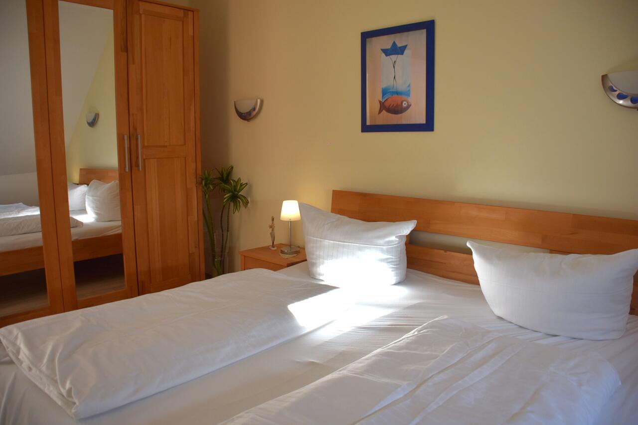 Wohnfläche:47 m² / 2 Räume Etage/Geschoss:1 Anzahl Personen:für bis zu 2 Personen Zustellbett möglich:nein Komfort:Gehobene Ausstattung Küche:ja (offene Einbauküche)komplett eingerichtet, mit 4-Plattenherd, Backofen, Mikrowelle, Kühlschrank mit Eisfach, Kaffeemaschine, Toaster, Wasserkocher, Geschirr, Geschirrspüler Wohnzimmer:Wohnzimmer mit doppelflügeliger Tür zum geschützten Südbalkon, lichtdurchflutet, freundlich, gemütlich und bequem möbliert, mit Farb-TV, Stereo-Anlage und CD-Player, Schlafzimmer:Schlafzimmer mit Doppelbett Bad:Duschbad mit WC (Tageslichtduschbad) Internetzugang:WLAN Dies ist eine freiwillige Leistung. Es besteht kein Rechtsanspruch Besonderheiten:Besonderes Highlight ist die einmalige Aussicht auf einen 1000 m² Teich