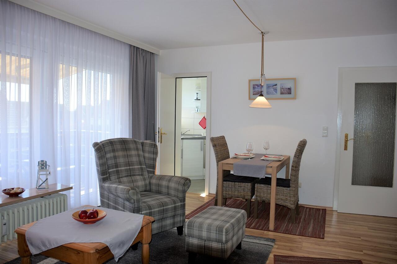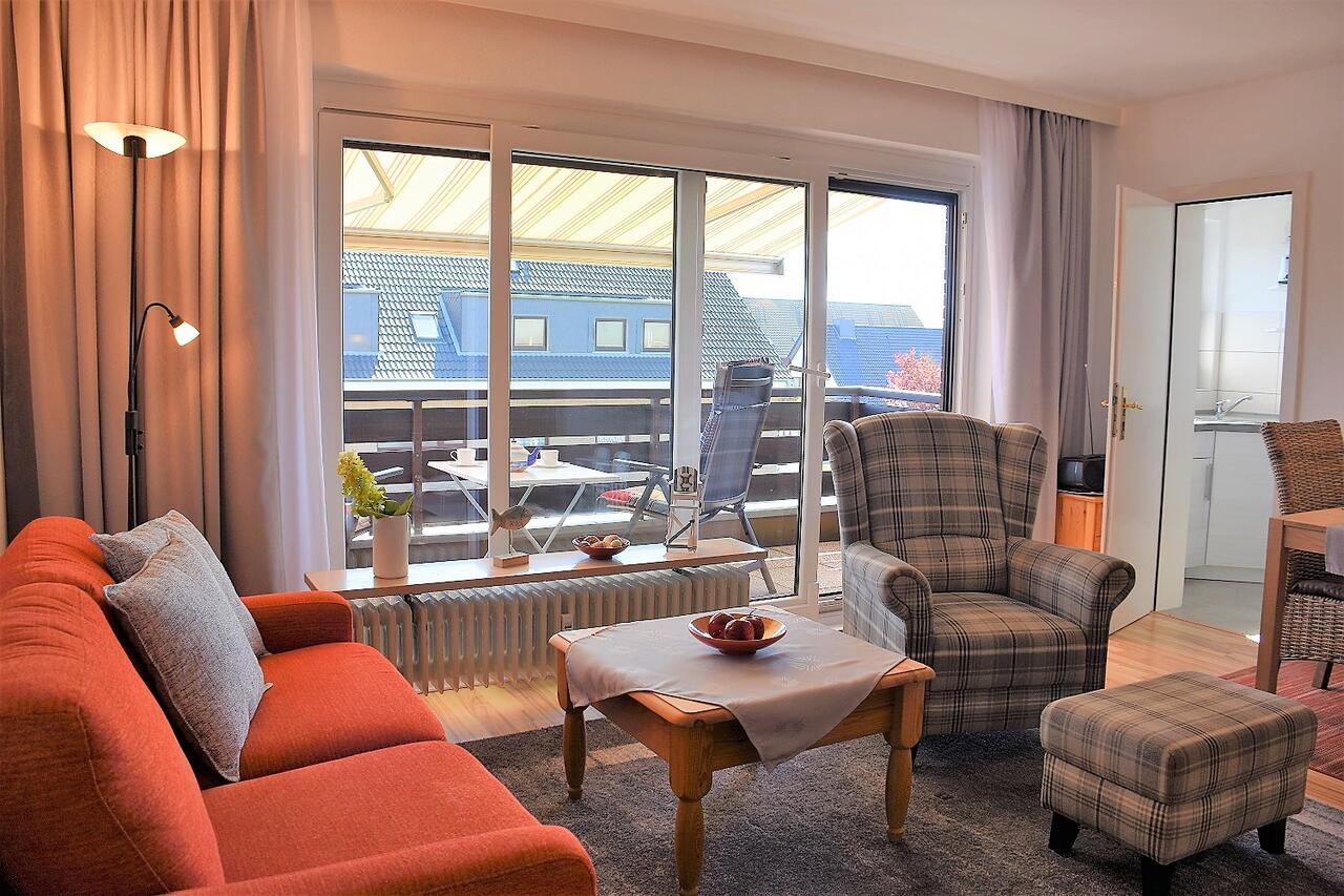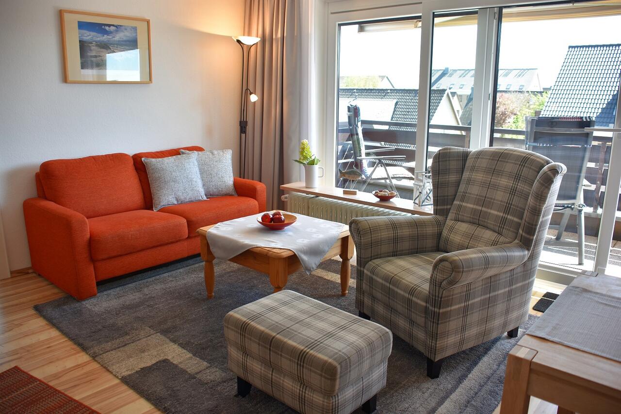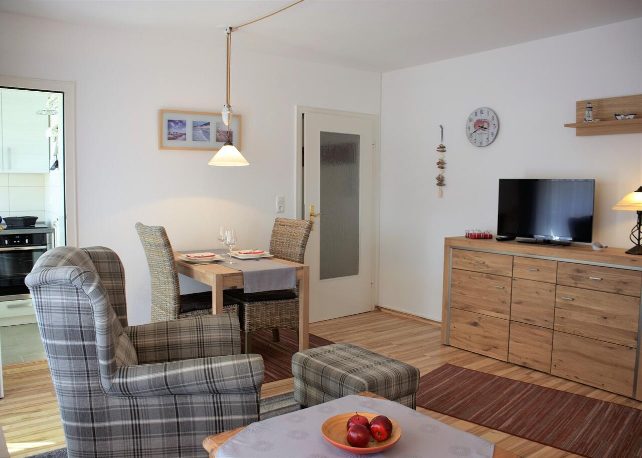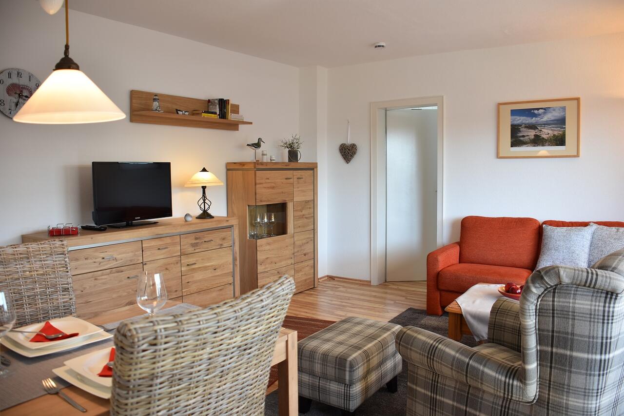 Im Wohnzimmer befindet sich ein Zweiersofa und ein Fernsehsessel mit Hocker für gemütliche Fernsehabende.