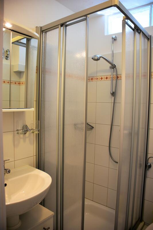 Das Duschbad ist funktional mit Duschkabine, Waschbecken und WC.