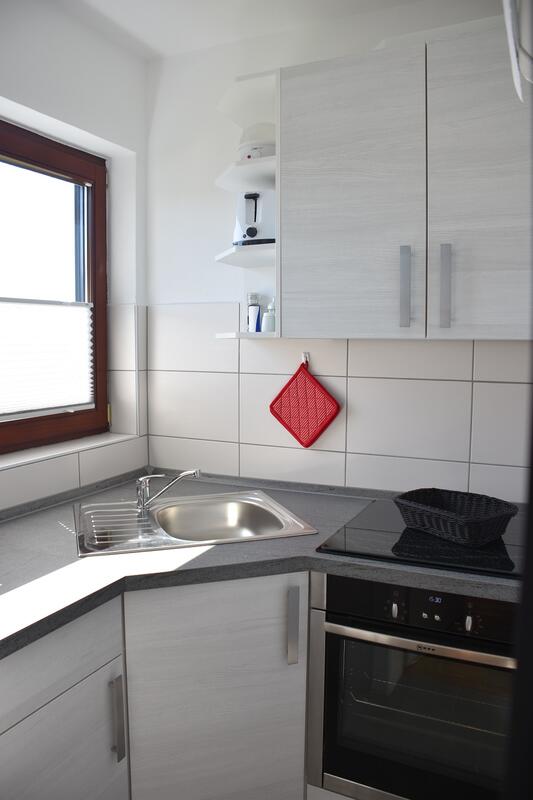 Die kleine Küche ist mit allen nötigen Haushaltsutensilien ausgestattet.
