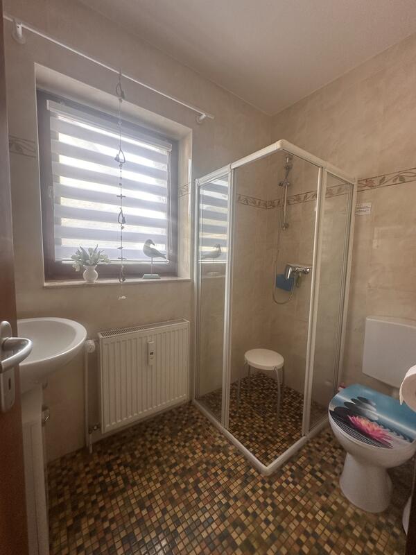 Das Badezimmer ist mit Dusche und WC ausgestattet.