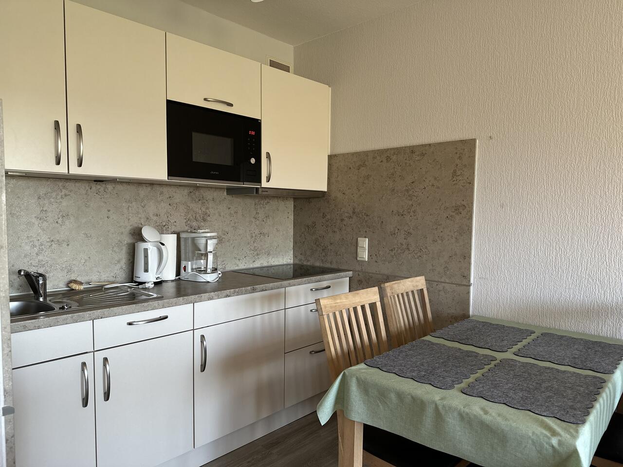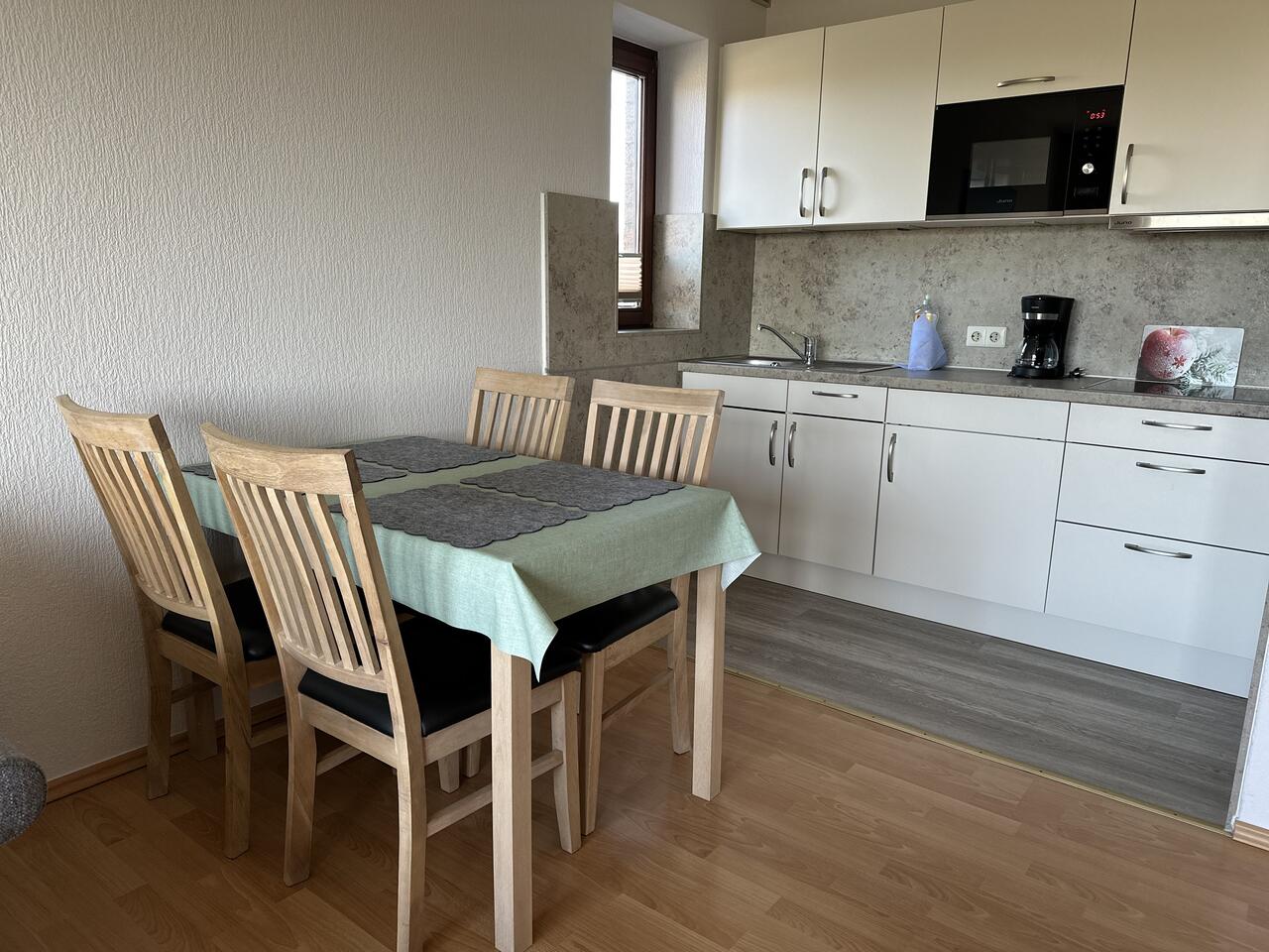 Die angrenzende Küchenzeile ist mit allen nötigen Küchenutensilien ausgestattet. Der Essbereich wird sicher nicht nur zu den gemeinsamen Mahlzeiten genutzt, sondern auch zum Klönschnack.