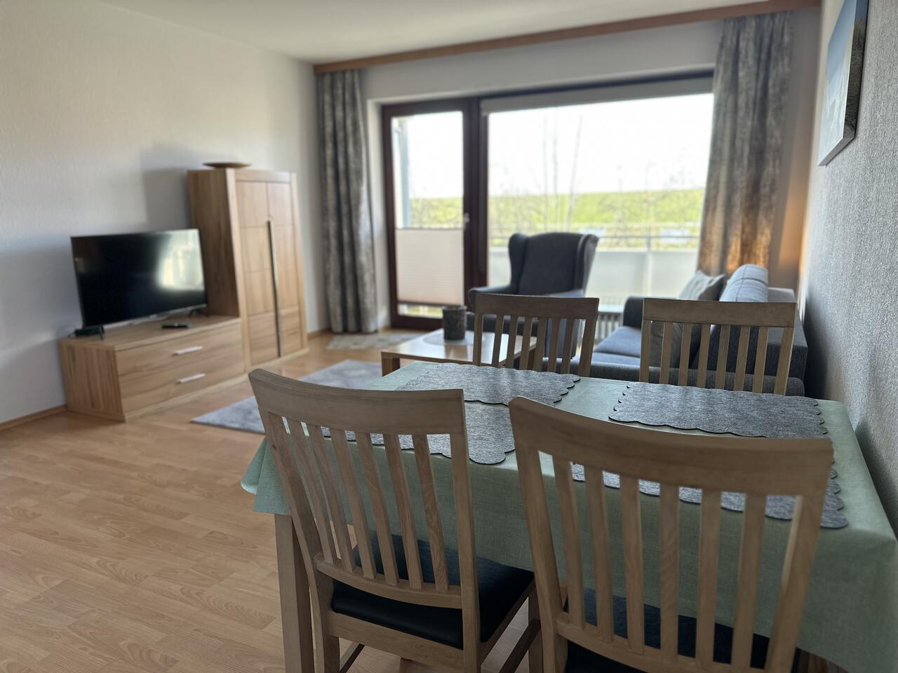 Das helle und gemütliche Wohnzimmer ist mit einem Schlafsofa, zwei Sesseln, einem Flachbild-TV sowie einem Essbereich für vier Personen komfortabel ausgestattet.