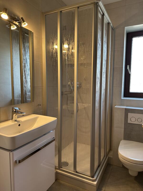 Das Duschbad ist mit einer Duschkabine, Waschbecken und WC ausgestattet.