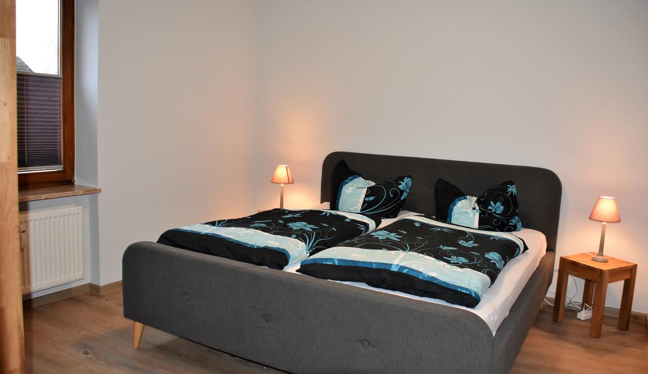 Das mit einem Doppelbett, Schrank und Kommode ausgestattete Schlafzimmer verspricht erholsamen Schlaf.