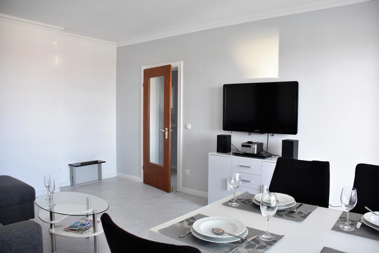 Das geräumige Wohnzimmer ist hell durch das große Balkonelement. Zur Ausstattung gehören ein Ecksofa mit Schlaffunktion, sowie ein Flachbild-TV und ein erhöhter Esstisch mit 4 Hocker.