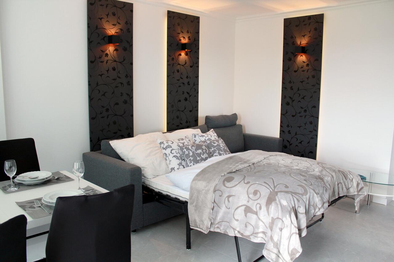 Zur Ausstattung gehören der Wohn-/Schlafraum mit Couch, Essplatz mit 2 Stühlen, Flachbild - TV, sowie ein gemütliches Bett mit bequemen Matratzen.