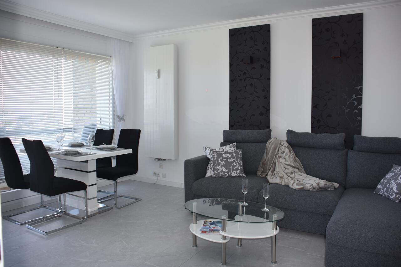Zur Ausstattung gehören der Wohnraum mit Couchgarnitur, Esstisch, Flachbild - TV und Appartementwand.