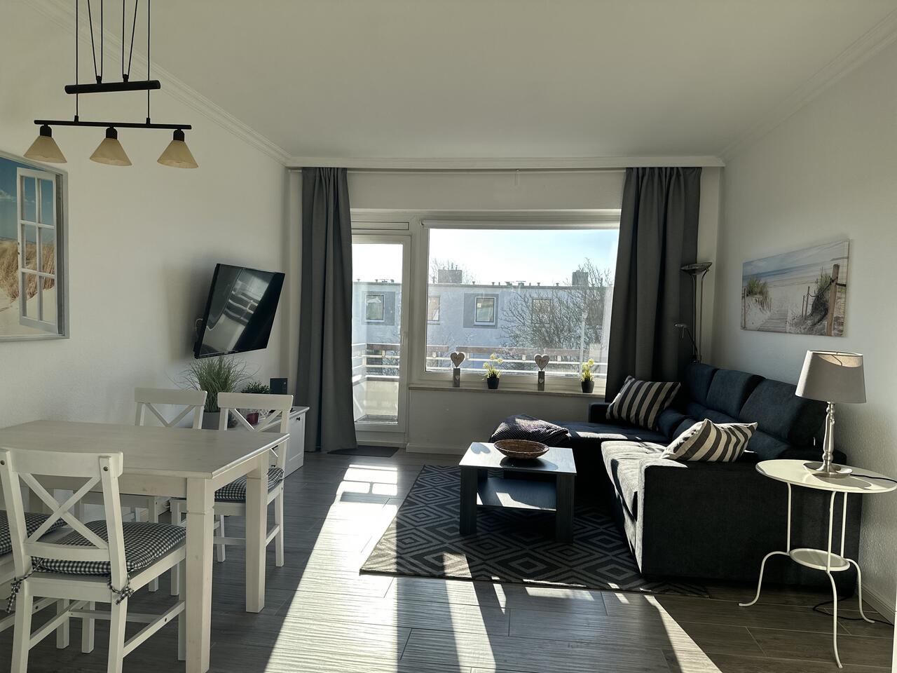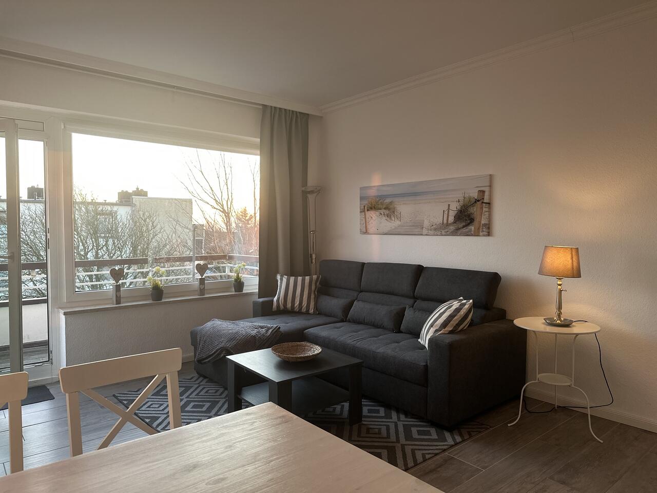 Das helle Wohnzimmer mit integrierter Küche ist der ideale Aufenthaltsort für Familienabende. Entspannen Sie bei einem guten Film auf dem gemütlichen Sofa, welches auch als Schlafsofa genutzt werden kann.